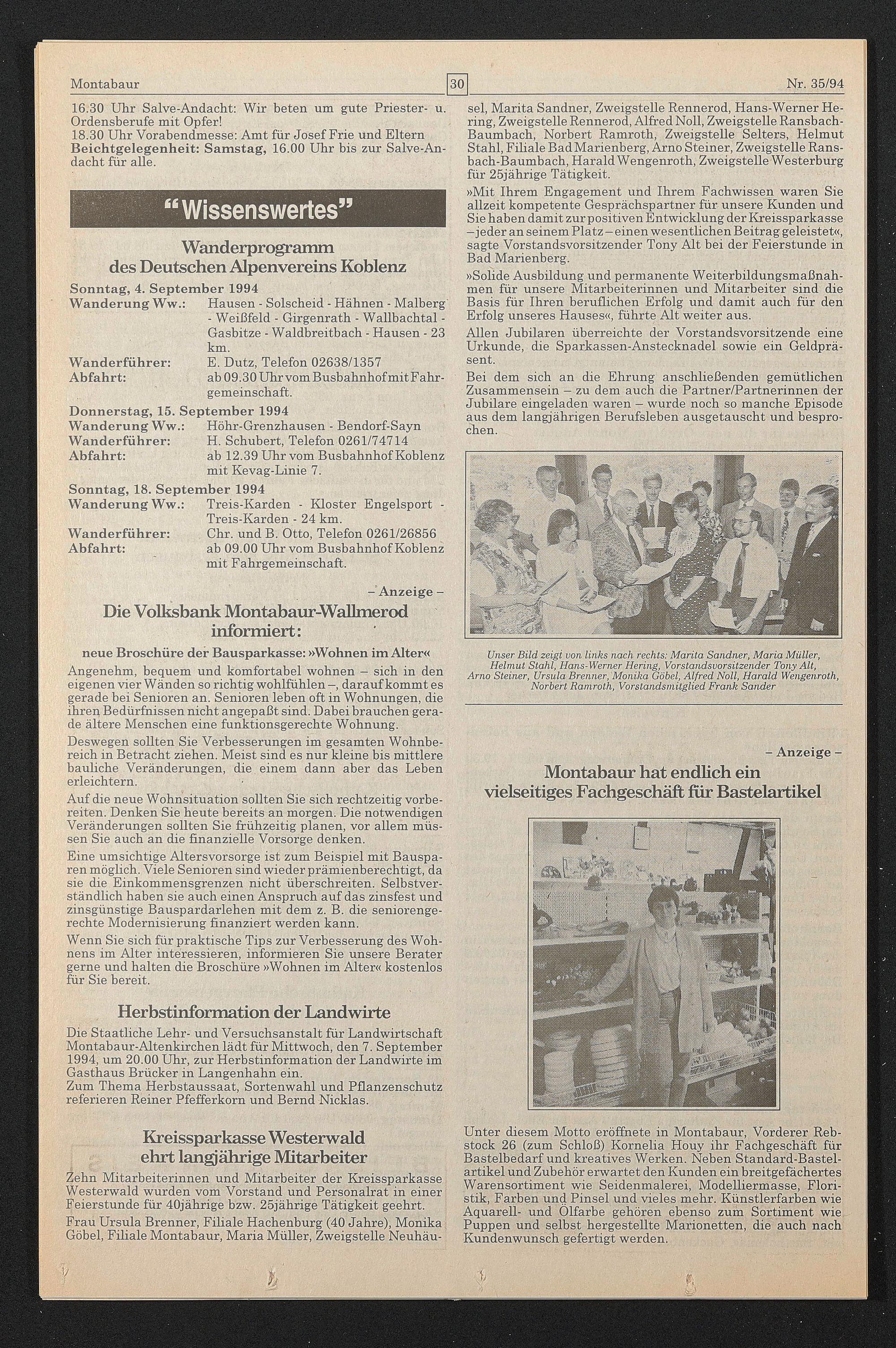sei, Marita Sandner, Zweigstelle Rennerod, Hans-Werner Hering, Zweigstelle Rennerod, Alfred Noll, Zweigstelle Ransbach- Baumbach, Norbert Ramroth, Zweigstelle Selters, Helmut Stahl, Filiale BadMarienberg, Arno Steiner, Zweigstelle Ransbach-Baumbach, Harald Wengenroth, Zweigstelle Westerburg für 25jährige Tätigkeit.