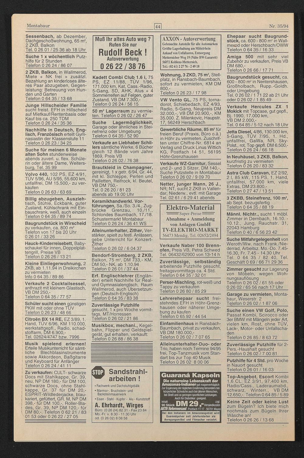 Balkon, 75 m 2 , DM 733,- KM, DM 50,-NK, ab 1.10.94 Telefon 0 26 01 / 37 44