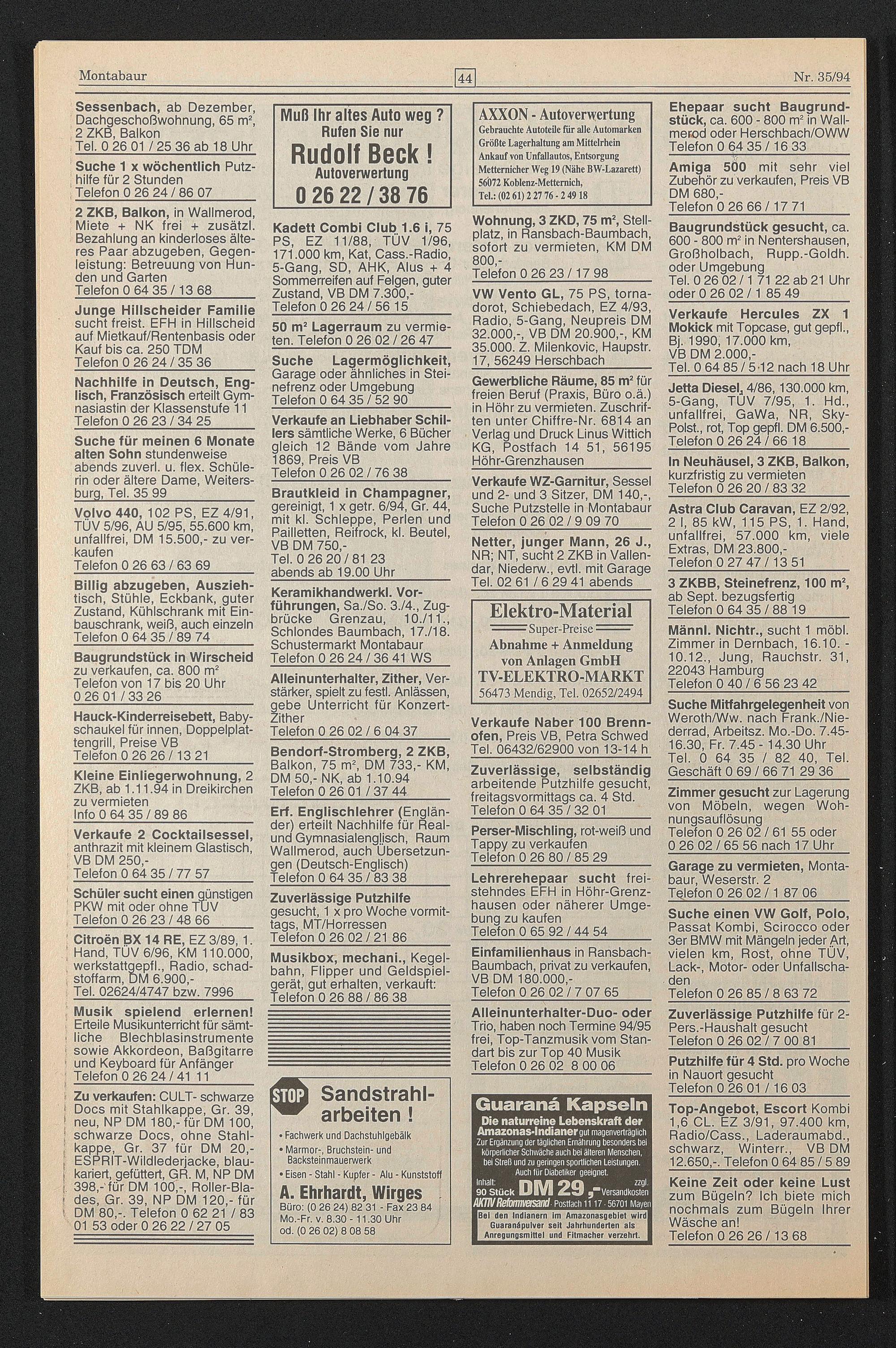 Büro: (0 26 24) 82 31 - Fax 23 84 Mo.-Fr. v. 8.30 -11.30 Uhr od. (0 26 02) 8 08 58