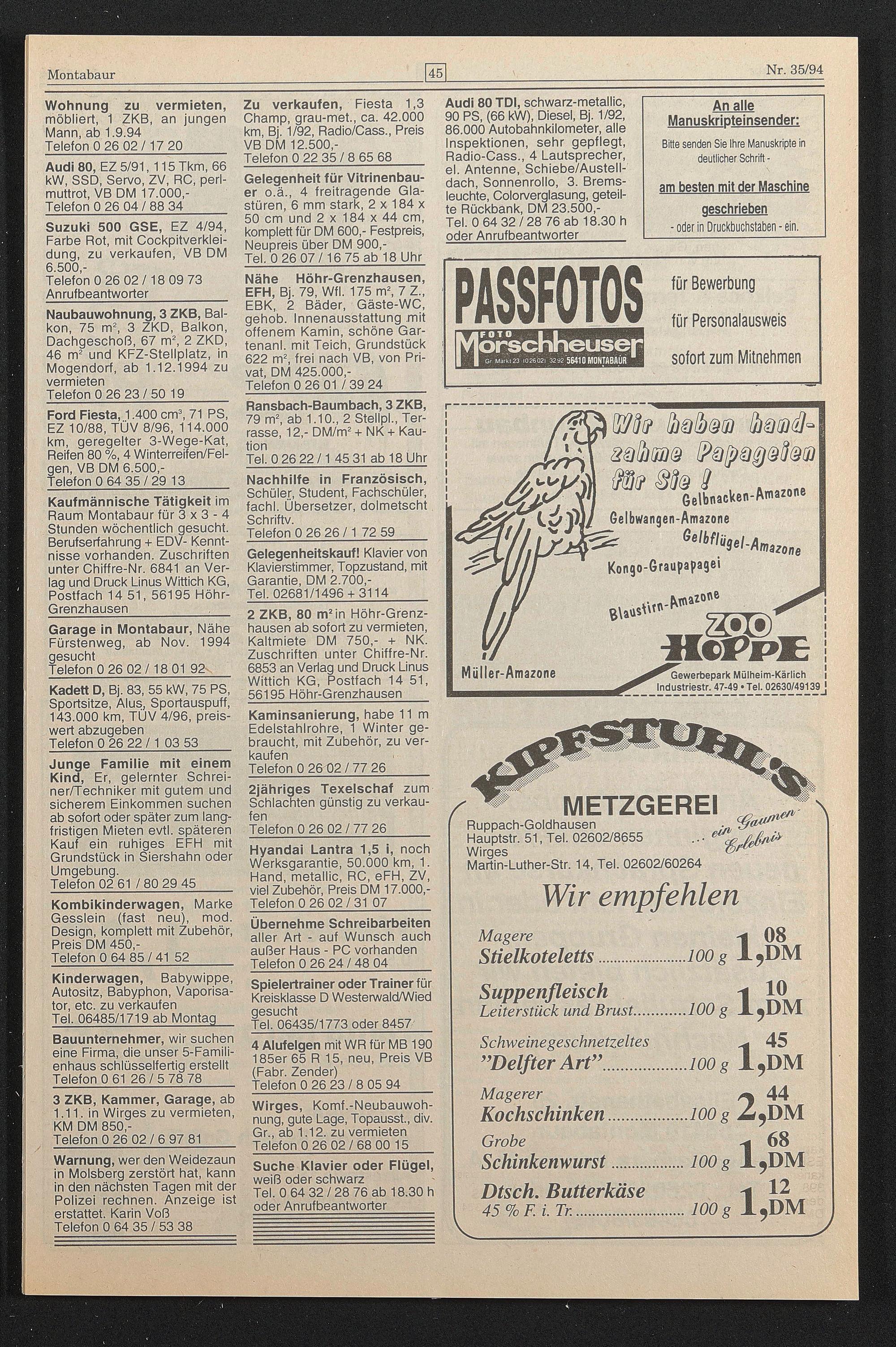 79 m 2 , ab 1.10., 2 Stellpl., Terrasse, 12,- DM/m 2 + NK + Kaution
