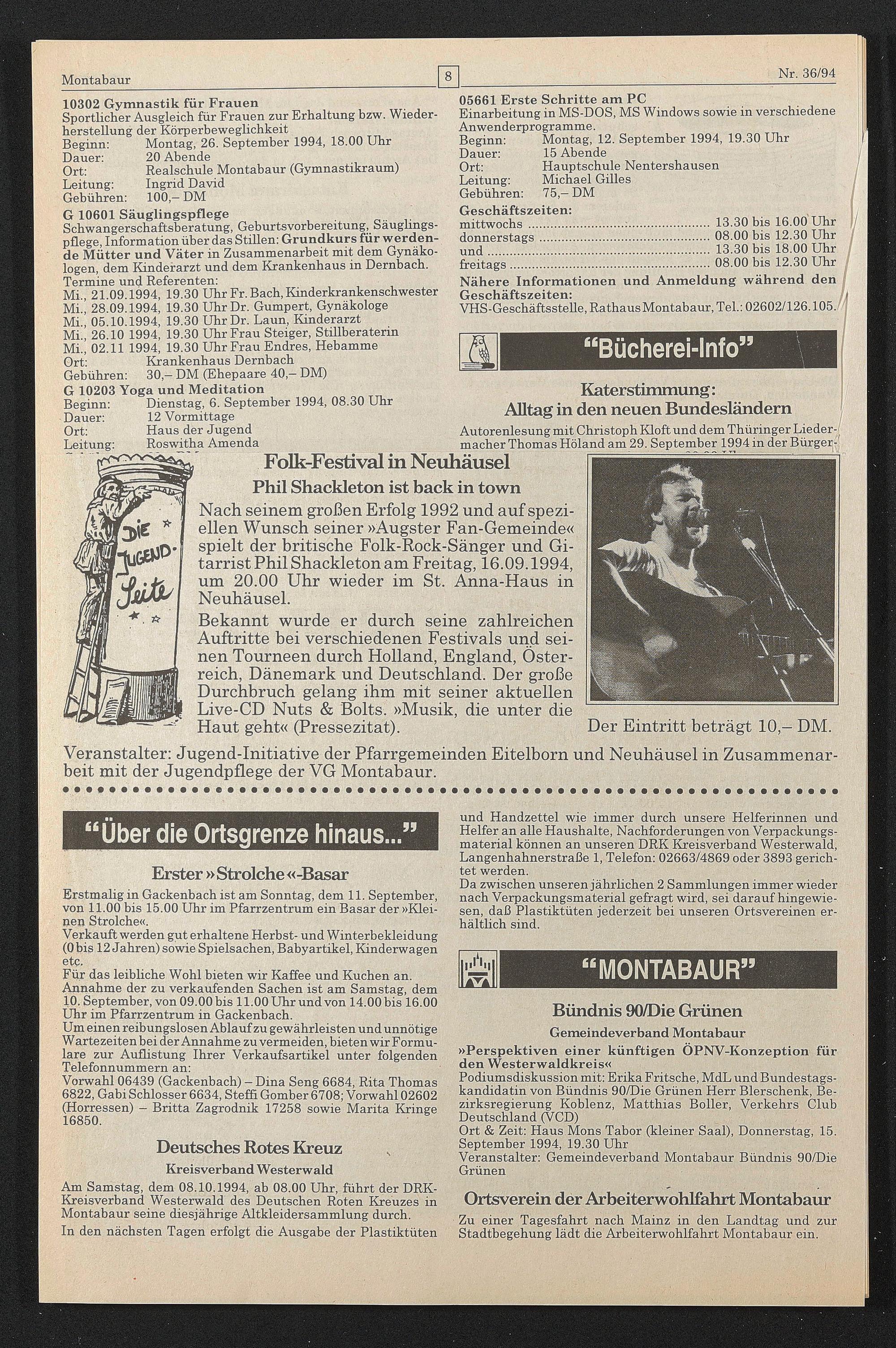 Nach seinem großen Erfolg 1992 und auf speziellen Wunsch seiner »Augster Fan-Gemeinde« spielt der britische Folk-Rock-Sänger und Gitarrist Phil Shackleton am Freitag, 16.09.1994, um 20.00 Uhr wieder im St. Anna-Haüs in Neuhäusel.