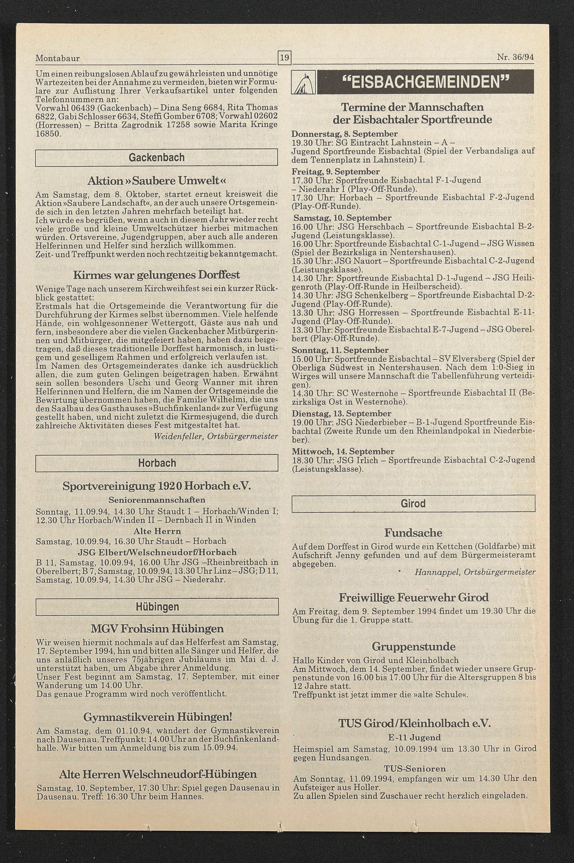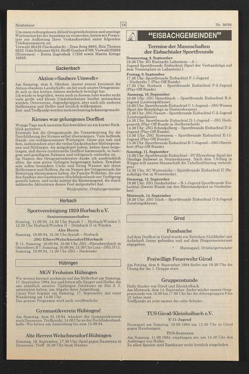 JSG Elbert/Welschneudorf/Horbach Bll, Samstag, 10.09.94, 16.00 Uhr JSG —Rheinbreitbach in Oberelbert; B 7, Samstag, 10.09.94,13.30UhrLinz-JSG;D 11, Samstag, 10.09.94, 14.30 Uhr JSG — Niederahr.