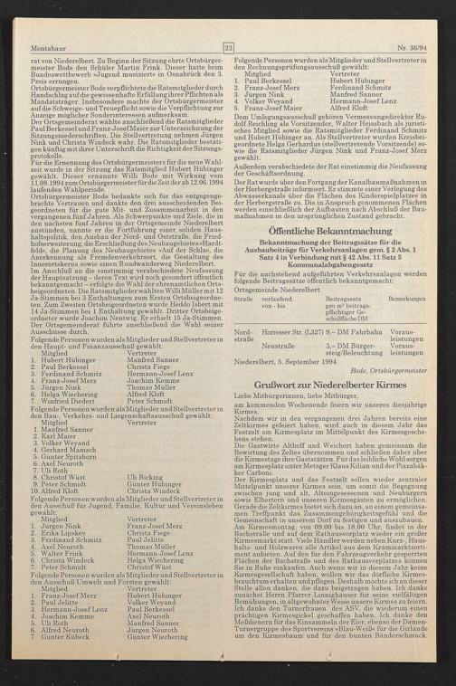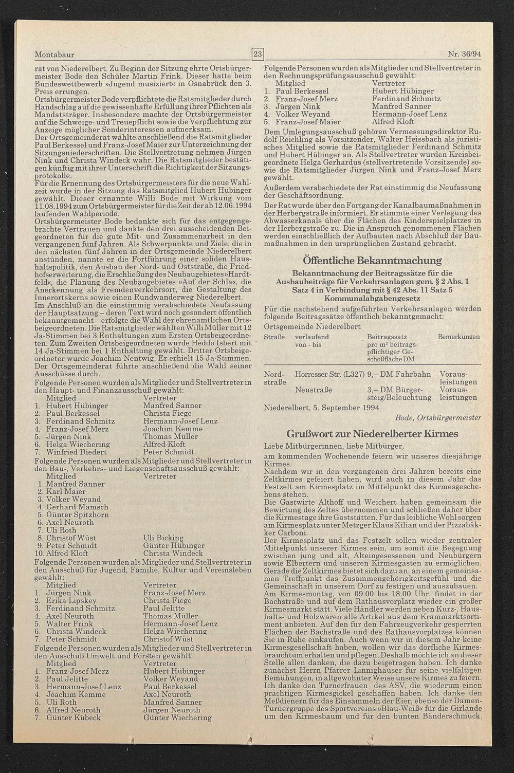 Für die Ernennung des Ortsbürgermeisters für die neue Wahlzeit wurde in der Sitzung das Ratsmitglied Hubert Hübinger gewählt. Dieser ernannte Willi Bode mit Wirkung vom 11.08.1994 zum Ortsbürgermeister für die Zeit der ab 12.06.1994 laufenden Wahlperiode.