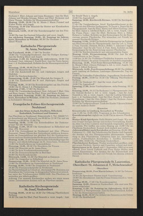 Mutter-Kind-Spielkreis: Hallo Mädels und Jungs. Wir sind eine Gruppe lustiger Zwerge und suchen Verstärkung. Kinder im Alter von 0 bis 3 Jahren sind herzlich eingeladen, mit uns zu spielen. Wir treffen uns jeden Montag um 15.00 Uhr im Pfarrheim Niederelbert. Kommt doch einfach mal vorbei. Jahreswallfahrt nach Bornhofen am Sonntag, 25.09.1994. Fahrpreis 11,— DM. Die Fahrtkosten für Kinder und Jugendliche werden von den Pfarrgemeinden übernommen. Anmeldung in den Pfarrämtern. Fahrpreis bitte bei Anmeldung zahlen. Fußwallfahrt Bornhofen: 1. Treffen Mittwoch, 14.09.1994, 19.00 Uhr, Pfarrheim Niederelbert. Pfarrbücherei Rathaus: Wieder wöchentlich geöffnet, jetzt mit neuen Büchern, Spielen und Cassetten, schaut mal rein! Küsterinnen in St. Josef, seit 1. September 1994 ist es nun offiziell. Frau Astrid Paffrath und Frau Helga Müller sind unsere Küsterinnen. Wir danken für die Bereitschaft und wünschen Gottes Segen und viel Freude bei diesem schönen Dienst.