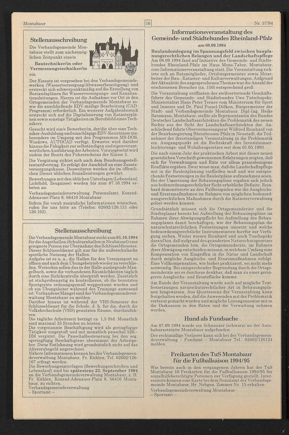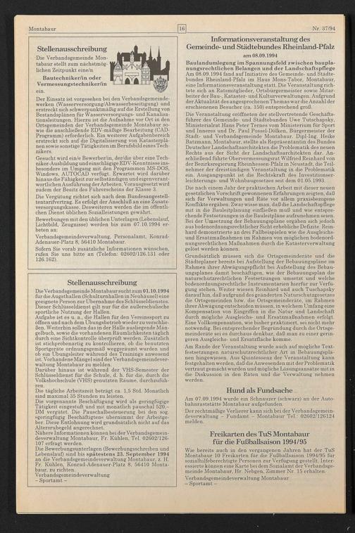 Die Bewerbungsunterlagen (Bewerbungsschreiben und Lebenslauf) sind bis spätestens 23. September 1994 an die Verbandsgemeindeverwaltung Montabaur, z. H. Fr. Kühlen, Konrad-Adenauer-Platz 8, 56410 Montabaur, zu richten.