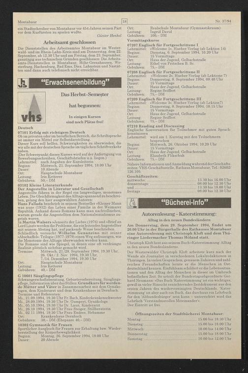 (Der Schwerpunkt dieses Kurses wird auf der Anfertigung von Bewerbungsschreiben, Geschäftsbriefen u.ä. Hegen.) Lehrmittel: nach Angaben der Kursleiterin Beginn: Mittwoch, 21. September 1994, 18.00 Uhr