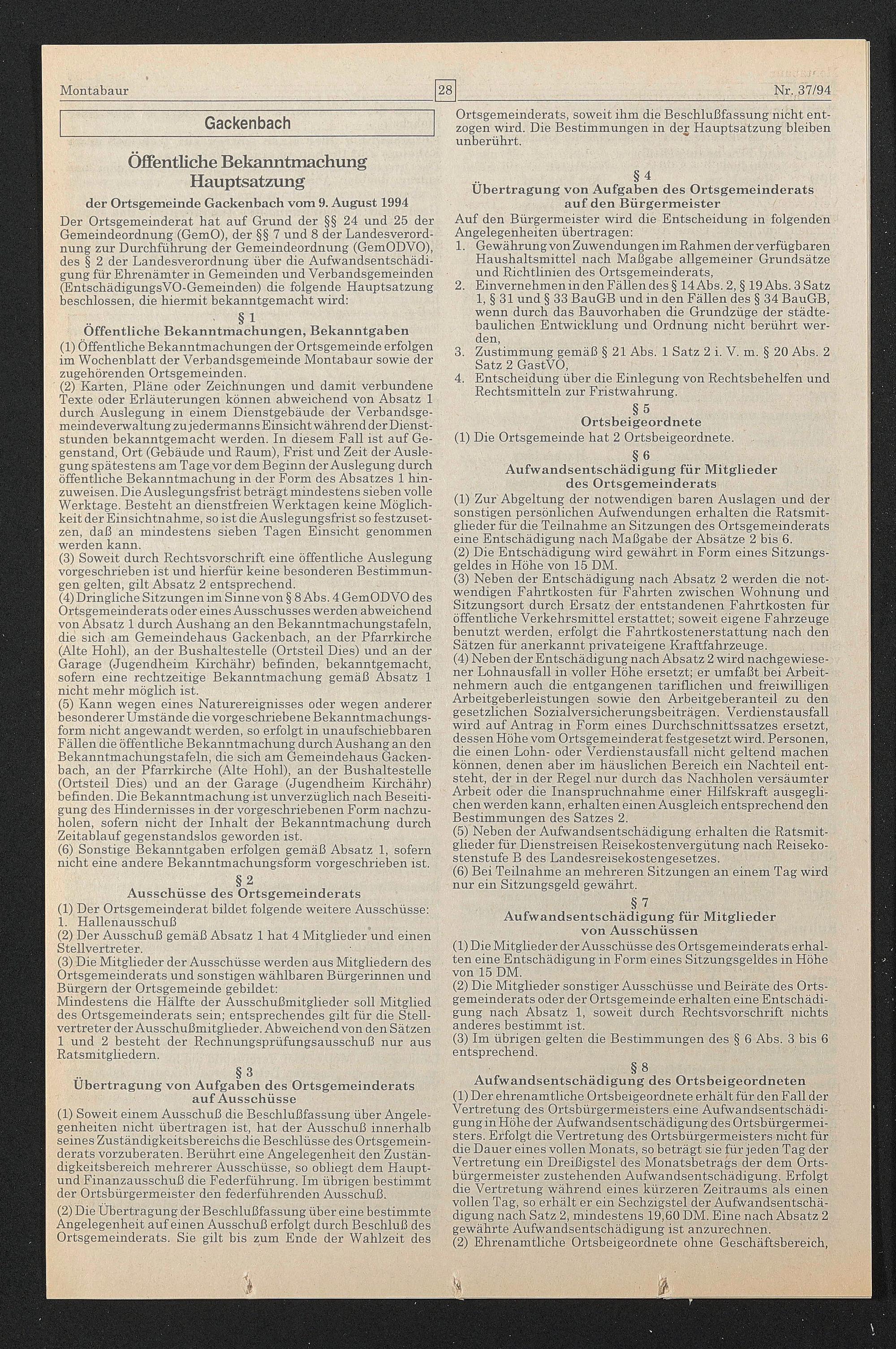 der Ortsgemeinde Gackenbach vom 9. August 1994