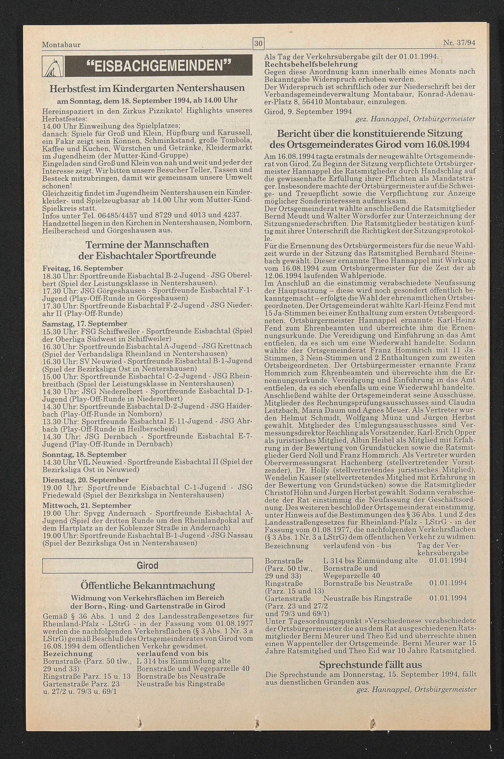 Für die Ernennung des Ortsbürgermeisters für die neue Wahlzeit wurde in der Sitzung das Ratsmitglied Bernhard Steinebach gewählt. Dieser ernannte Theo Hannappel mit Wirkung vom 16.08.1994 zum Ortsbürgermeister für die Zeit der ab 12.06.1994 laufenden Wahlperiode.