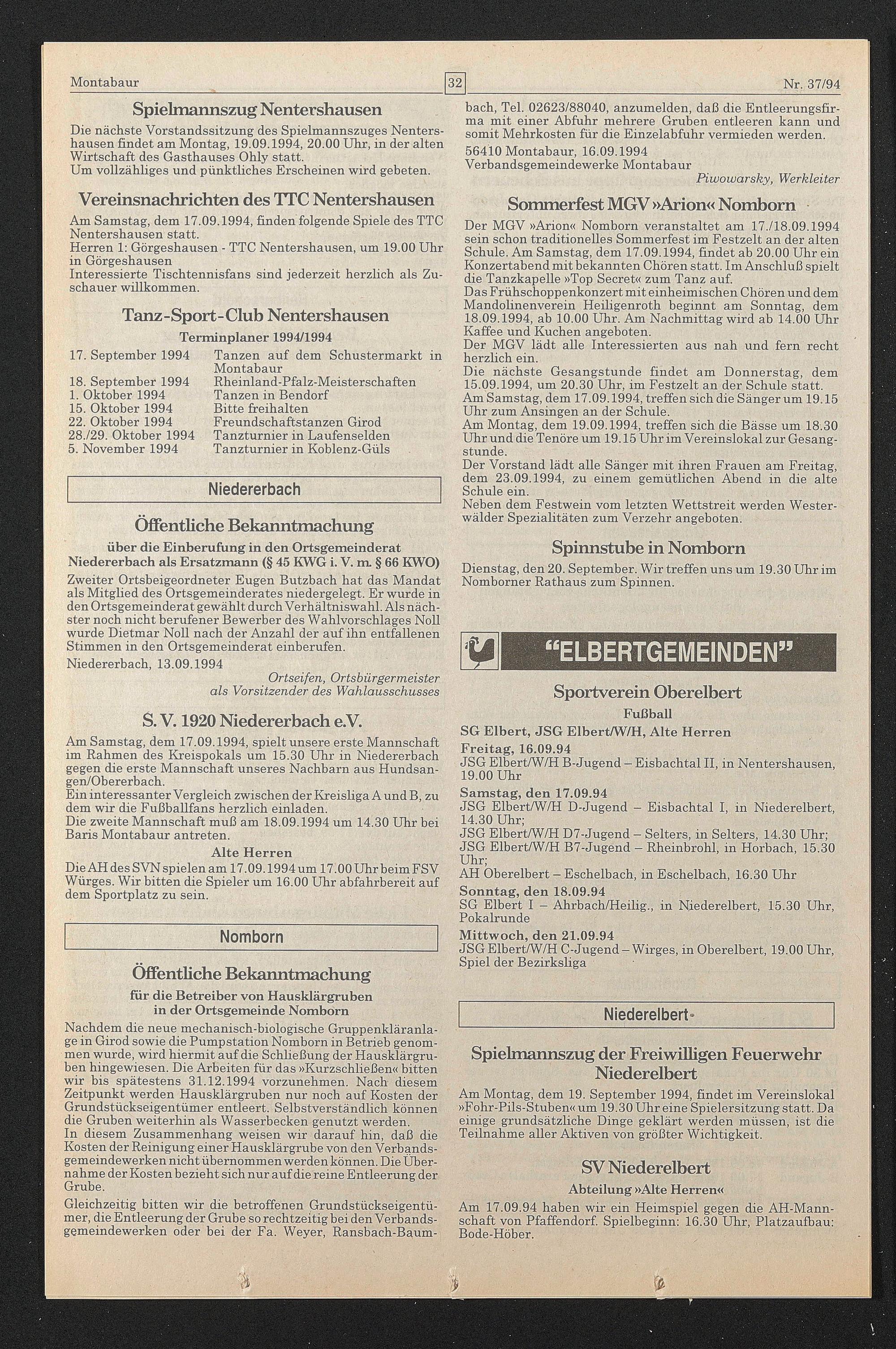 Der MGV »Arion« Nomborn veranstaltet am 17./18.09.1994 sein schon traditionelles Sommerfest im Festzelt an der alten Schule. Am Samstag, dem 17.09.1994, findet ab 20.00 Uhr ein Konzertabend mit bekannten Chören statt. Im Anschluß spielt die Tanzkapelle »Top Secret« zum Tanz auf.