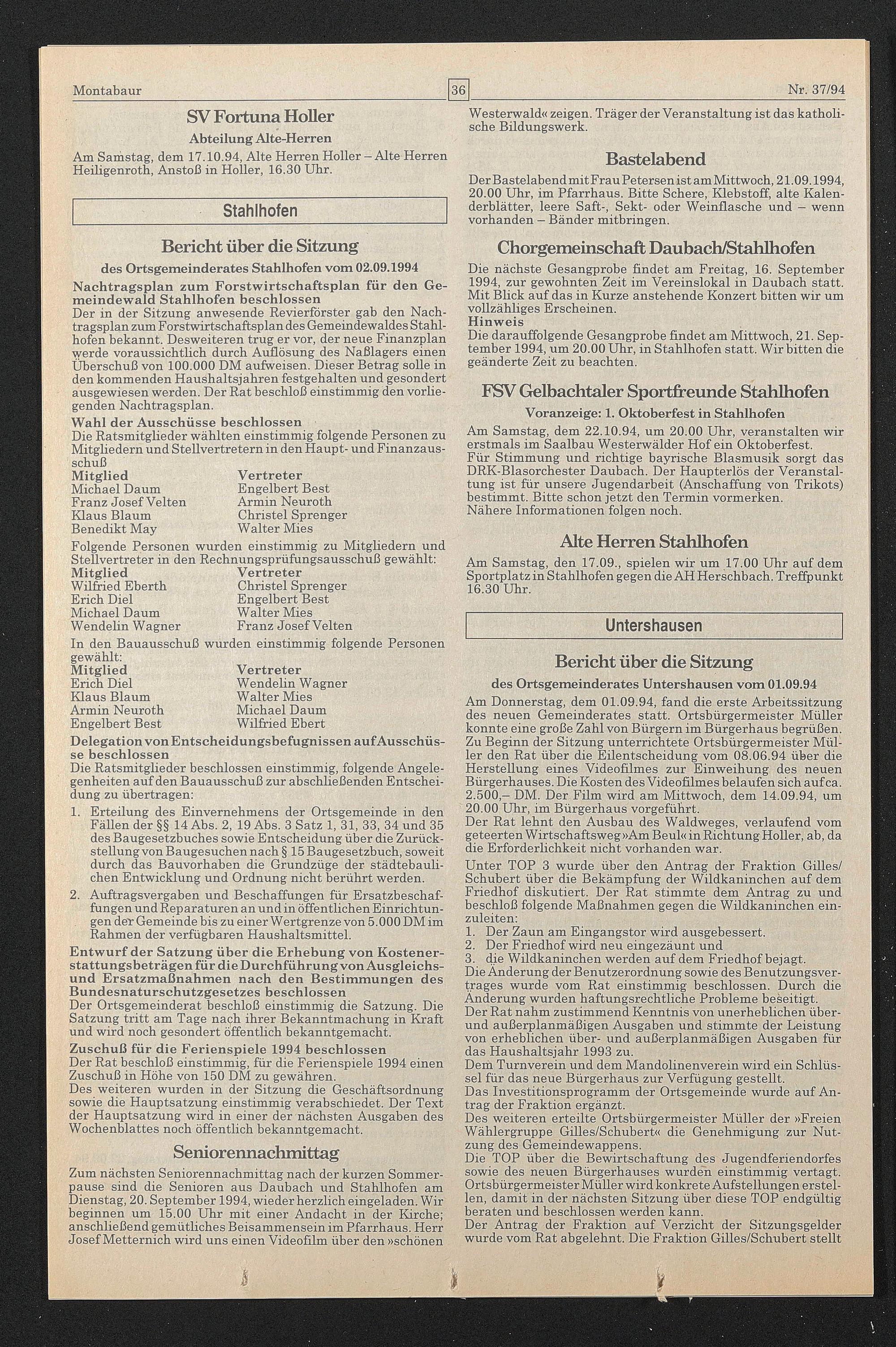 Zum nächsten Seniorennachmittag nach der kurzen Sommerpause sind die Senioren aus Daubach und Stahlhofen am Dienstag, 20. September 1994, wieder herzlich eingeladen. Wir beginnen um 15.00 Uhr mit einer Andacht in der Kirche; anschließend gemütliches Beisammensein im Pfarrhaus. Herr Josef Metternich wird uns einen Videofilm über den »schönen