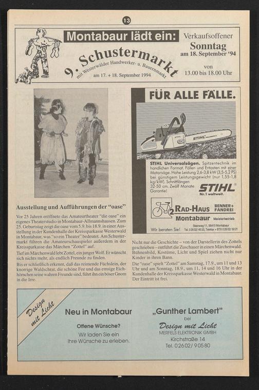 Vor 25 Jahren eröffnete das Amateurtheater “die oase” ein eigenes Theaterstudio in Montabaur-Allmannshausen. Zum 25. Geburtstag zeigt die oase vom 5.9. bis 18.9. in einer Ausstellung in der Kundenhalle der Kreissparkasse Westerwald in Montabaur, was “so ein Theater” bedeutet. Am Schustermarkt führen die Amateurschauspieler außerdem in der Kreissparkasse das Märchen “Zottel” auf.