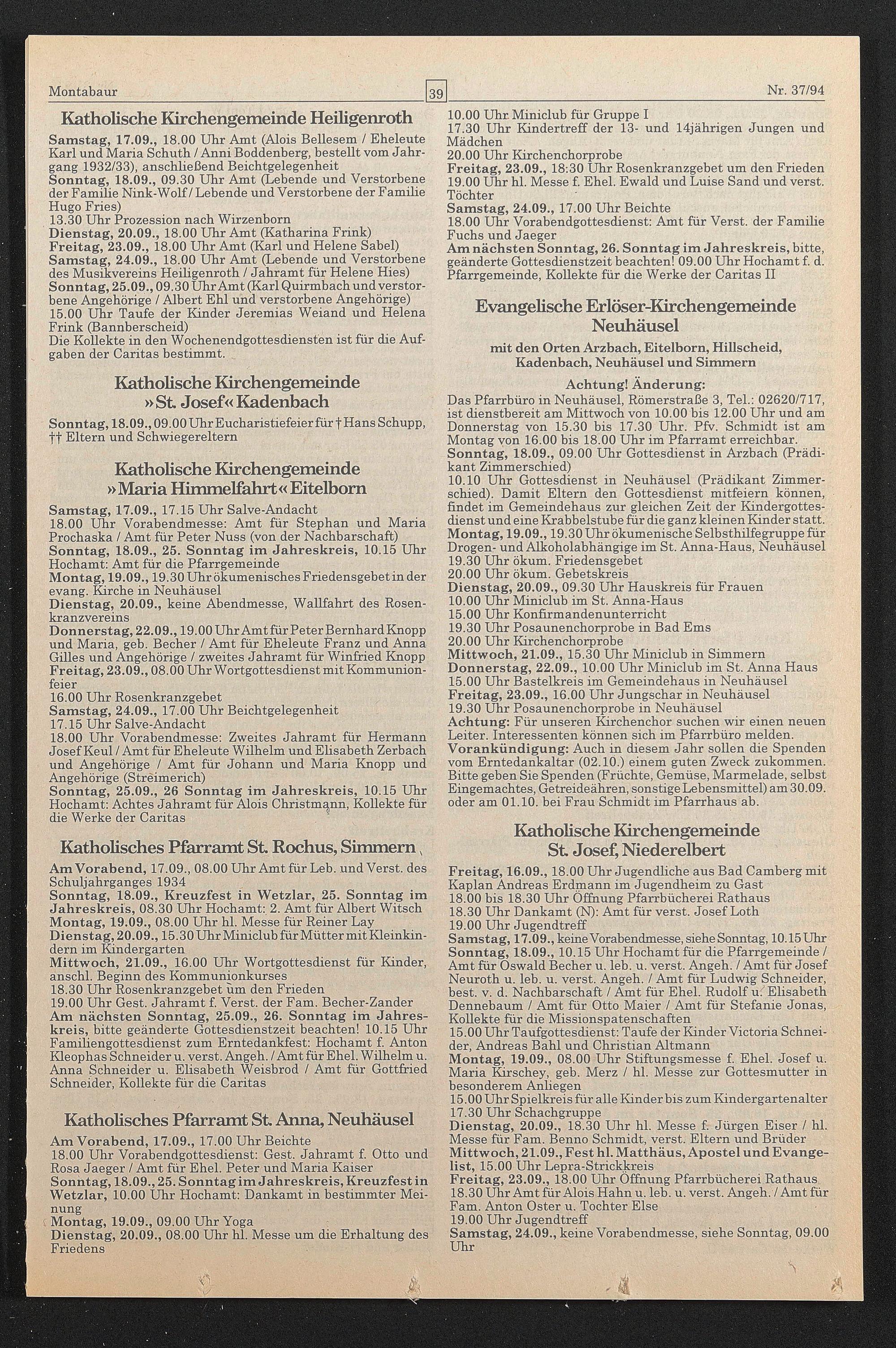 10.10 Uhr Gottesdienst in Neuhäusel (Prädikant Zimmerschied). Damit Eltern den Gottesdienst mitfeiern können, findet im Gemeindehaus zur gleichen Zeit der Kindergottesdienst und eine Krabbelstube für die ganz kleinen Kinder statt. Montag, 19.09., 19.30 Uhr ökumenische Selbsthilfegruppe für Drogen- und Alkoholabhängige im St. Anna-Haus, Neuhäusel