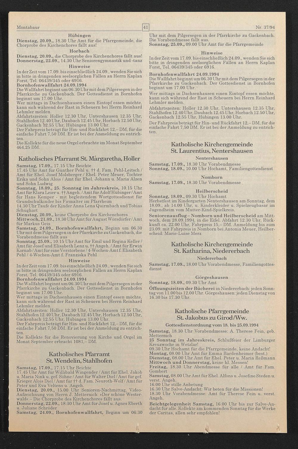 Gottesdienstordnung vom 18. bis 25.09.1994