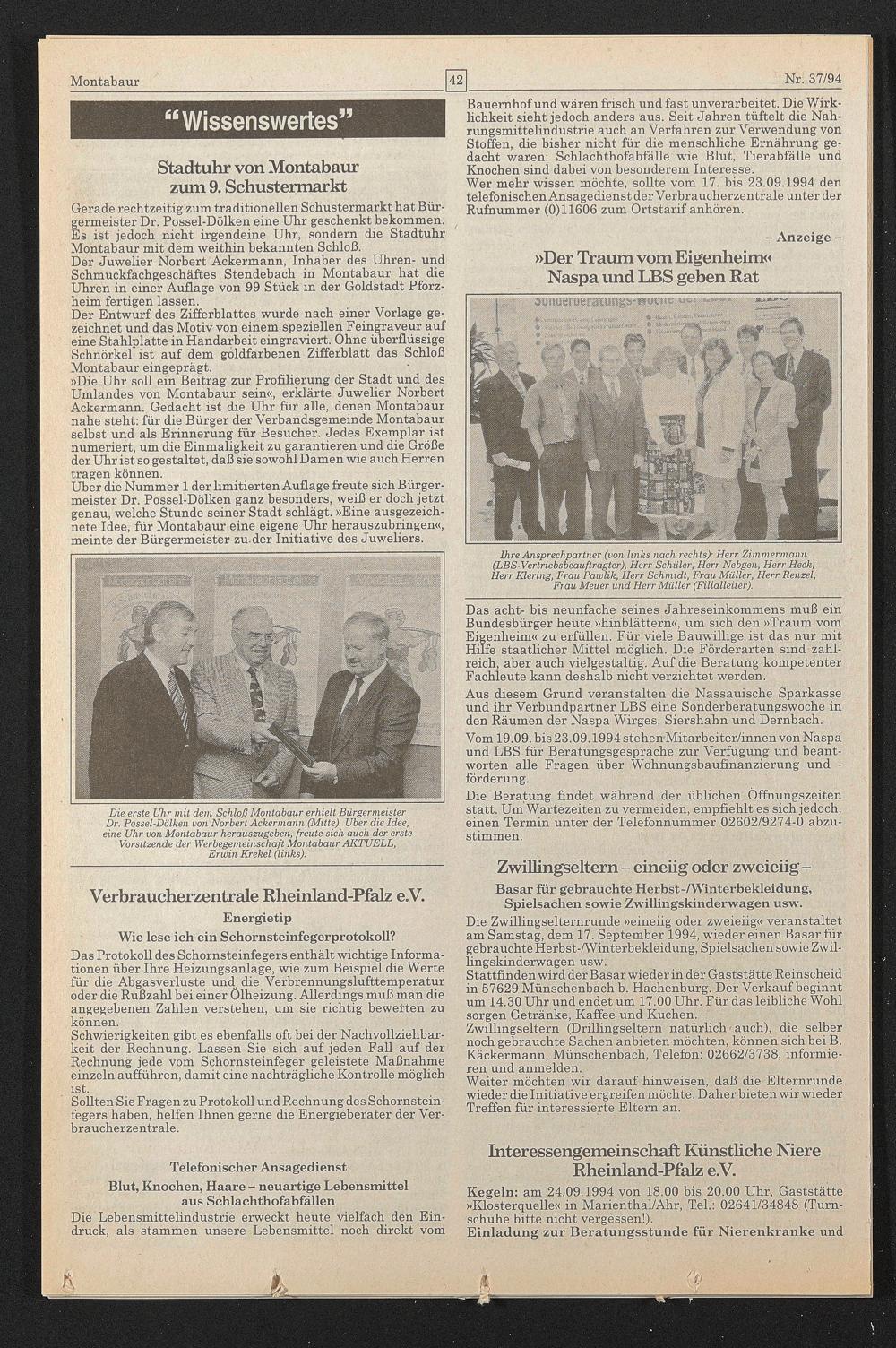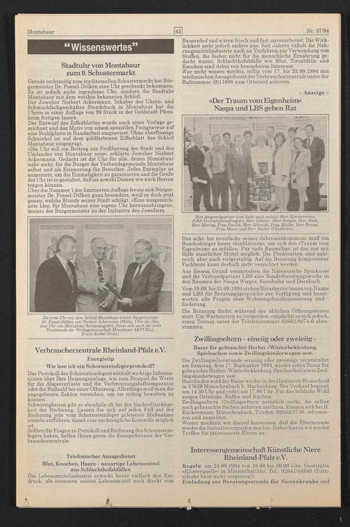 Vom 19.09.bis23.09.1994stehenMitarbeiter/innenvonNaspa und LBS für Beratungsgespräche zur Verfügung und beantworten alle Fragen über Wohnungsbaufinanzierung und - forderung.