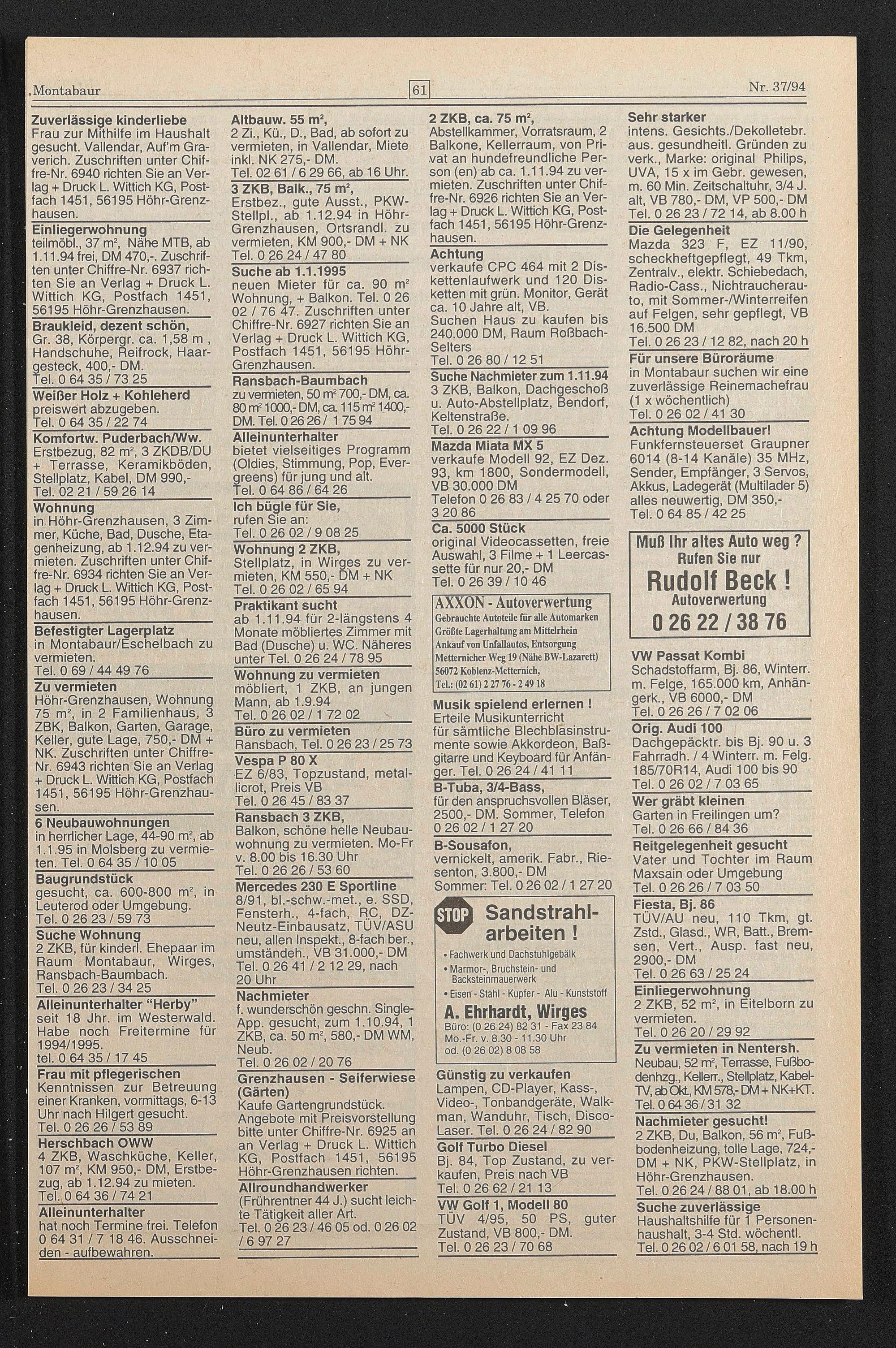 Höhr-Grenzhausen, Wohnung 75 m 2 , in 2 Familienhaus, 3 ZBK, Balkon, Garten, Garage, Keller, gute Lage, 750,- DM + NK. Zuschriften unter Chiffre- Nr. 6943 richten Sie an Verlag + Druck L. Wittich KG, Postfach 1451,56195 Höhr-Grenzhau- sen._