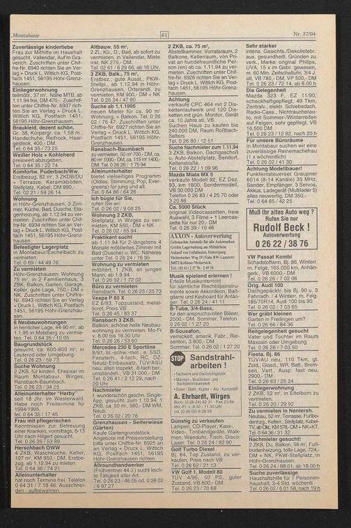 Einliegerwohnung teilmöbl., 37 m * 2 * 4 , Nähe MTB, ab 1.11.94 frei, DM 470,-. Zuschriften unter Chiffre-Nr. 6937 richten Sie an Verlag + Druck L. Wittich KG, Postfach 1451, 56195 Höhr-Grenzhausen.
