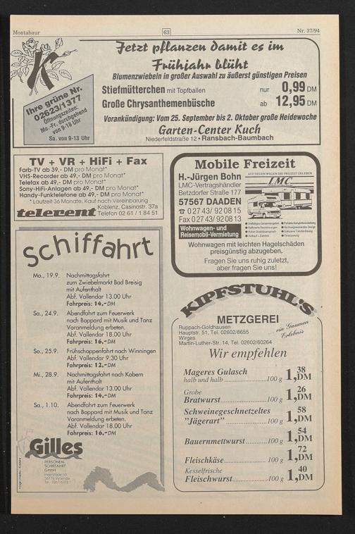 Mi., 28.9, Nachmittagsfahrt nach Kobern mit Aufenthalt Abf. Vallendar 13.00 Uhr Fahrpreis: 14,-DM