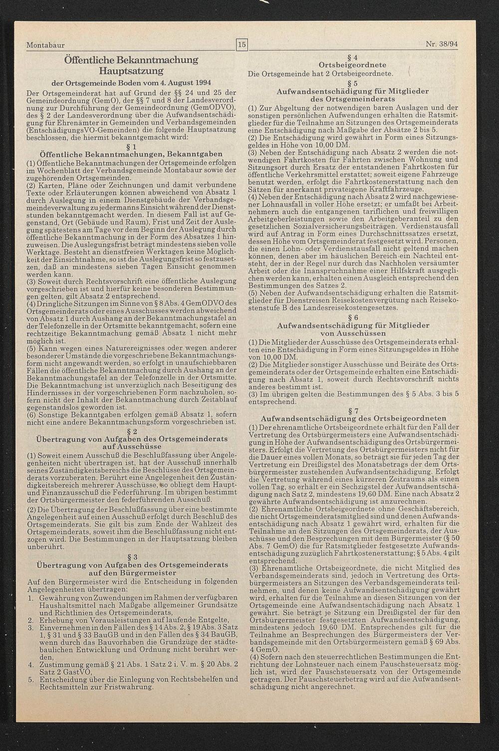 der Ortsgemeinde Boden vom 4. August 1994
