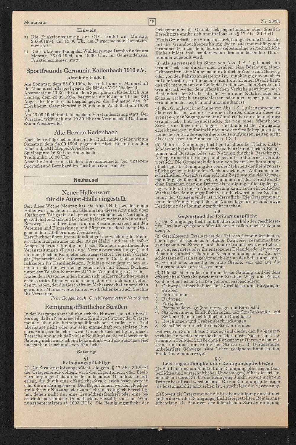 In der Vergangenheit häufen sich die Hinweise aus der Bevölkerung, daß in Neuhäusel die z, Z. gültige Satzung der Ortsgemeinde über die Reinigung öffentlicher Straßen zum Teil überhaupt nicht oder nur sehr mangelhaft von einigen Bürgern/Anliegern beachtet wird. Unter Berücksichtigung dieser Tatsache und auch daß vielen Neubürgern die entsprechende Satzung nicht ausreichend bekannt ist, wird sie auszugsweise nachstehend nochmals veröffentlicht: