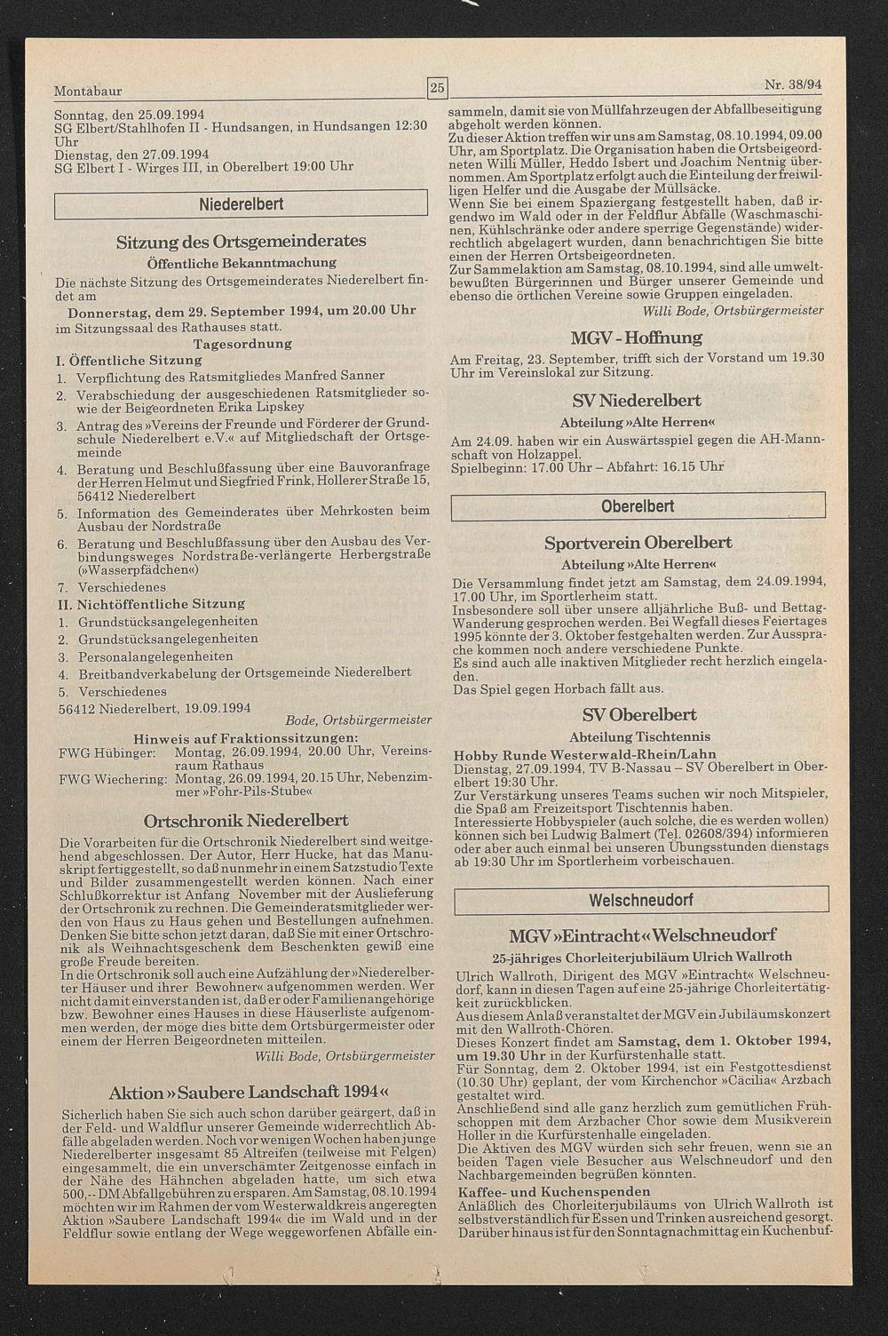 Sicherlich haben Sie sich auch schon darüber geärgert, daß in der Feld- und Waldflur unserer Gemeinde widerrechtlich Abfälle abgeladen werden. Noch vorwenigen Wochen haben junge Niederelberter insgesamt 85 Altreifen (teilweise mit Felgen) eingesammelt, die ein unverschämter Zeitgenosse einfach in der Nähe des Hähnchen abgeladen hatte, um sich etwa 500,- DM Abfallgebühren zu ersparen. Am Samstag, 08.10.1994 möchten wir im Rahmen der vom Westerwaldkreis angeregten Aktion »Saubere Landschaft 1994« die im Wald und in der Feldflur sowie entlang der Wege weggeworfenen Abfälle ein