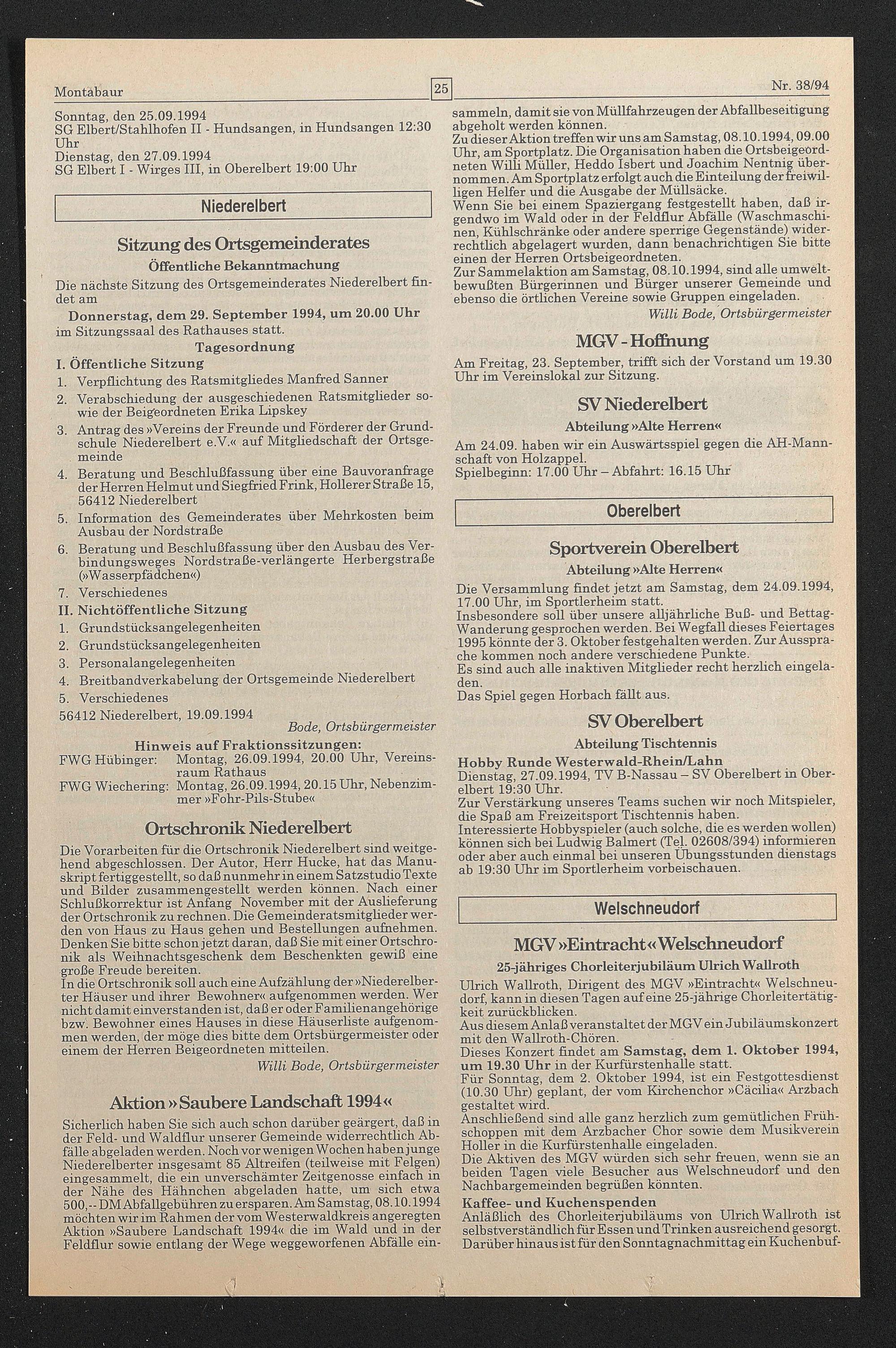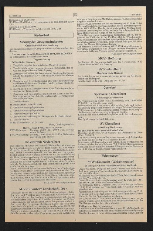Zu dieser Aktion treffen wir uns am Samstag, 08.10.1994,09.00 Uhr, am Sportplatz. Die Organisation haben die Ortsbeigeordneten Willi Müller, Heddo Isbert und Joachim Nentnig übernommen. Am Sportplatz erfolgt auch die Einteilung der freiwilligen Helfer und die Ausgabe der Müllsäcke.