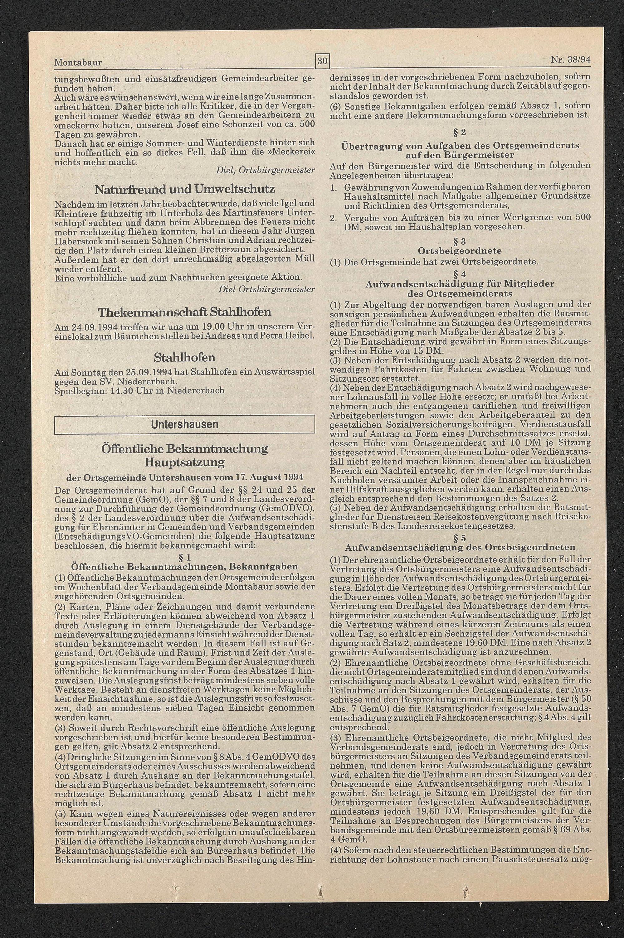 der Ortsgemeinde Untershausen vom 17. August 1994
