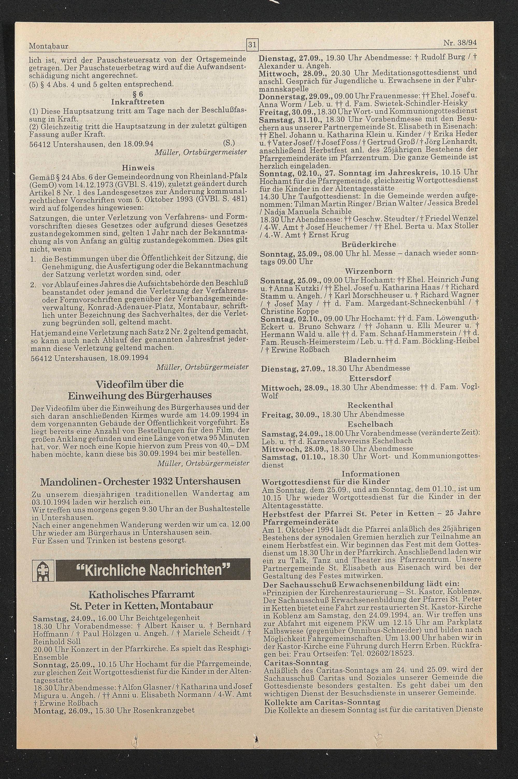Der Videofilm über die Einweihung des Bürgerhauses und der sich daran anschließenden Kirmes wurde am 14.09.1994 in dem vorgenannten Gebäude der Öffentlichkeit vorgeführt. Es hegt bereits eine Anzahl von Bestellungen für den Film, der großen Anklang gefunden und eine Länge von etwa 95 Minuten hat, vor. Wer noch eine Kopie hiervon zum Preis von 40,- DM haben möchte, kann diese bis 30.09.1994 bei mir bestellen.