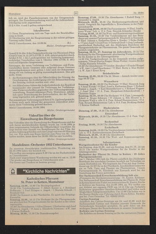 Der Sachausschuß Erwachsenenbildung lädt ein: »Prinzipien der Kirchenrestaurierung — St. Kastor, Koblenz«. Der Sachausschuß Erwachsenenbildung der Pfarrei St. Peter in Ketten bietet eine Fahrt zur restaurierten St. Kastor-Kirche in Koblenz am Samstag, den 24.09.1994, an. Wir treffen uns zur Abfahrt mit eigenem PKW um 12.15 Uhr am Parkplatz Kalbswiese (gegenüber Omnibus-Schneider) und bilden nach Möglichkeit Fahrgemeinschaften. Um 13.00 Uhr haben wir in der Kastor-Kirche eine Führung durch Herrn Erben. Rückfragen bei: Frau Ortseifen: Tel. 02602/18523.