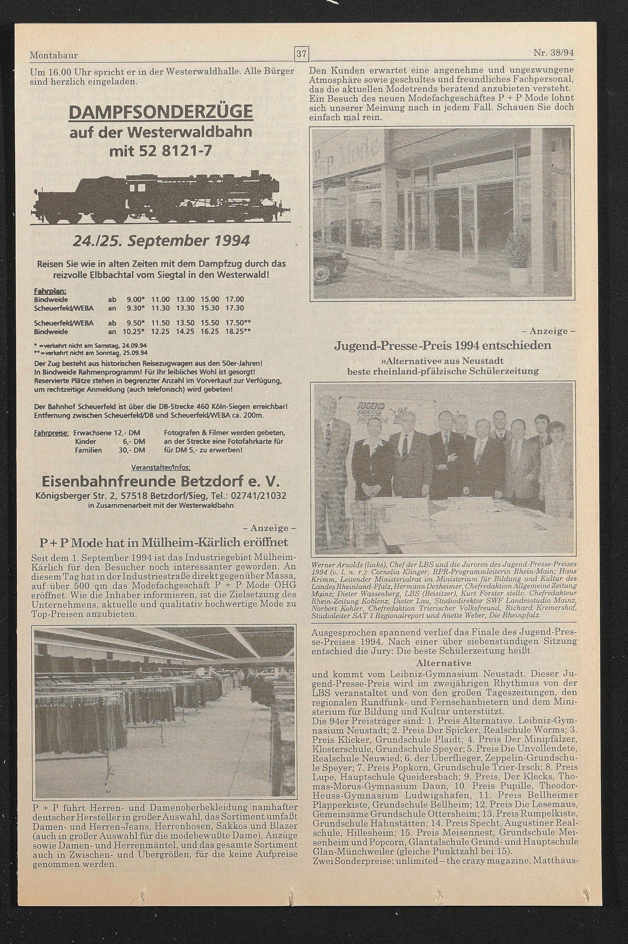 Die 94er Preisträger sind: 1. Preis Alternative, Leibniz-Gymnasium Neustadt; 2. Preis Der Spicker, Realschule Worms; 3. Preis Klicker, Grundschule Plaidt; 4. Preis Der Minipfälzer, Klosterschule, Grundschule Speyer; 5. Preis Die Unvollendete, Realschule Neuwied; 6. der Überflieger, Zeppelin-Grundschule Speyer; 7. Preis Popkorn, Grundschule Trier-Irsch; 8. Preis Lupe, Hauptschule Queidersbach; 9. Preis, Der Klecks, Tho- mas-Morus-Gymnasium Daun, 10. Preis Pupille, Theodor- Heuss-Gymnasium Ludwigshafen, 11. Preis Bellheimer Plapperkiste, Grundschule Beflheim; 12. Preis Die Lesemaus, Gemeinsame Grundschule Ottersheim; 13. Preis Rumpelkiste, Grundschule Hahnstätten; 14. Preis Specht, Augustiner Realschule, Hillesheim; 15. Preis Meisennest, Grundschule Meisenheim und Popcorn, Glantalschule Grund- und Hauptschule Glan-Münchweüer (gleiche Punktzahl bei 15).