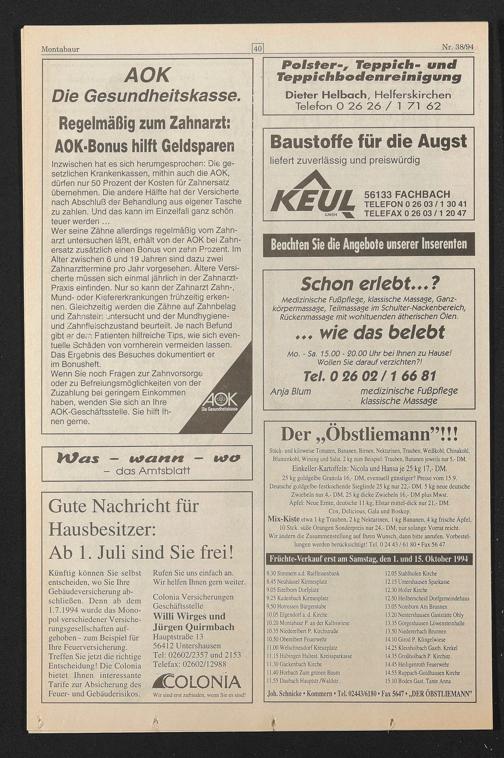 Früchte-Verkauf erst am Samstag, den 1. und 15. Oktober 1994