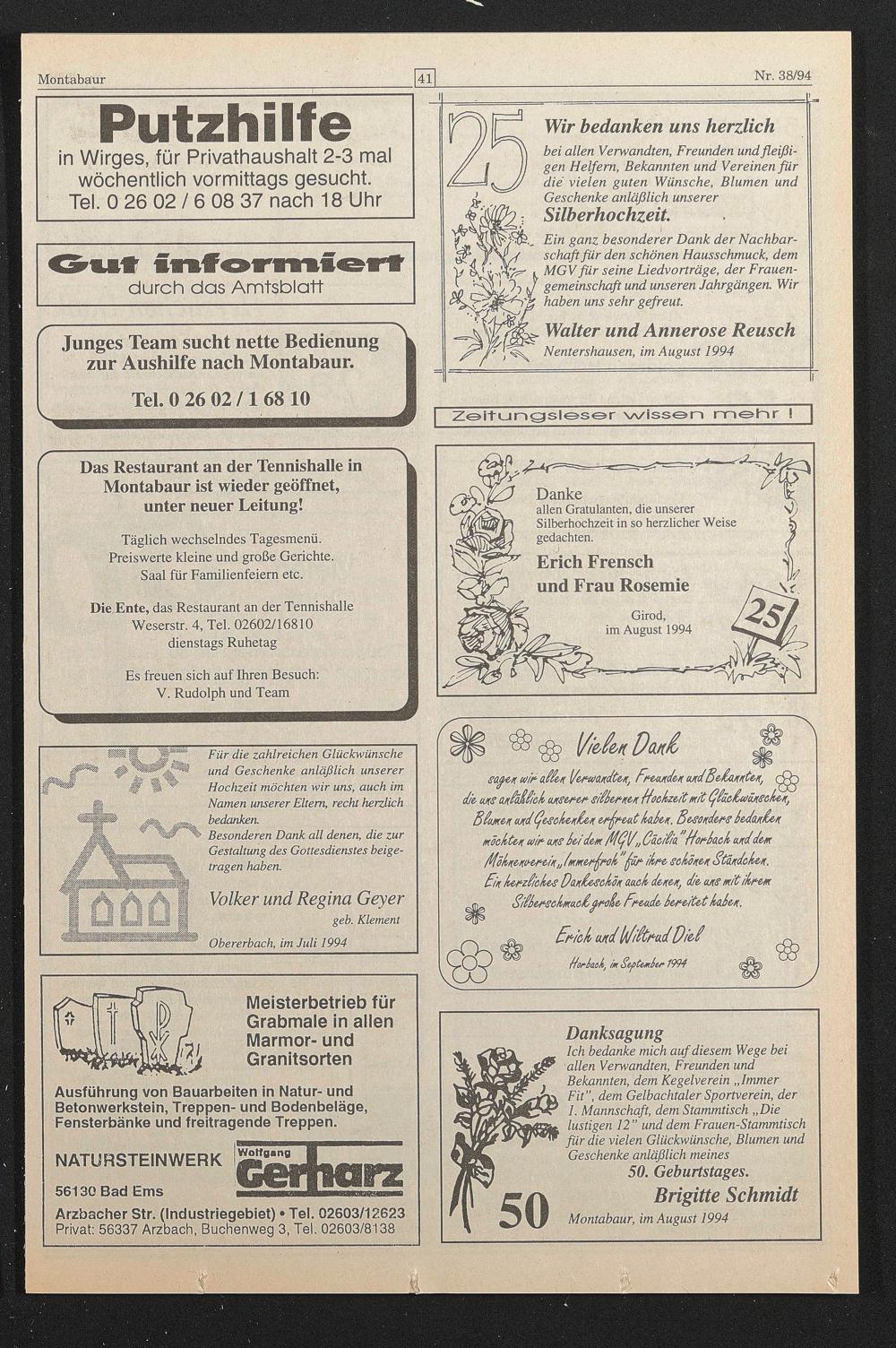 Ich bedanke mich auf diesem Wege bei allen Verwandten, Freunden und Bekannten, dem Kegelverein „Immer Fit”, dem Gelbachtaler Sportverein, der 1. Mannschaft, dem Stammtisch „Die lustigen 12” und dem Frauen-Stammtisch für die vielen Glückwünsche, Blumen und Geschenke anläßlich meines
