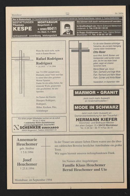 Neu in Niedererbach: Im Trauerfall können Sie sich auch vertrauensvoll wenden an: Familie Rudolf Becker, Hahnstn 5, Telefon 06485/8284