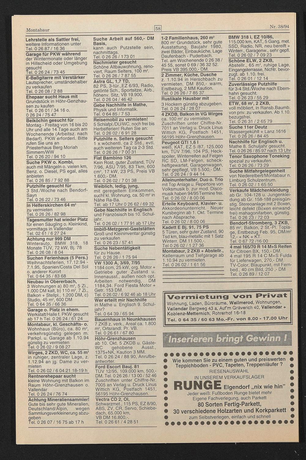 Montabaur, 2 ZKB + Abstellr., Kellerraum und Tiefgarage ab 1.10.94 zu vermieten.