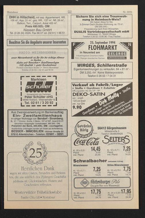 Eigentumswohnungen zu verkaufen, 64 + 81 m 2 - DM 3.250,-/m 2 . Keine Maklerprovision. Telefon 0 26 02/7 04 31