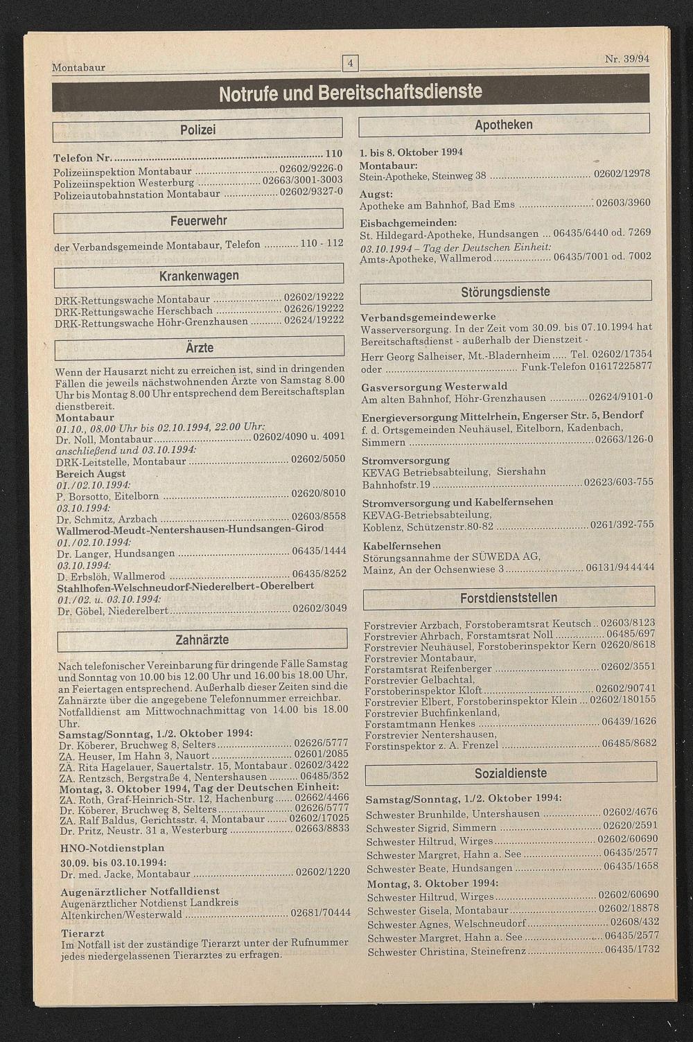 St. Hildegard-Apotheke, Hundsangen ... 06435/6440 od. 7269 03.10.1994- Tag der Deutschen Einheit:
