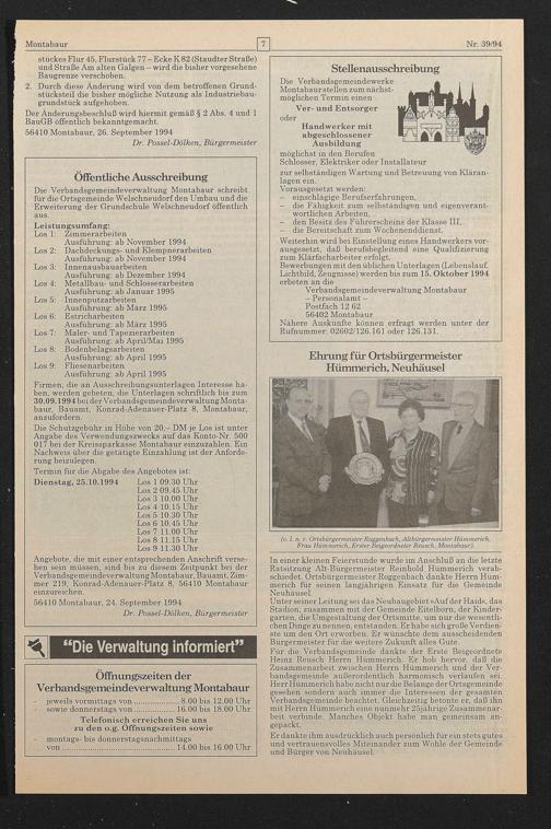Unter seiner Leitung sei das Neubaugebiet »Auf der Haid«, das Stadion, zusammen mit der Gemeinde Eitelborn, der Kindergarten, die Umgestaltung der Ortsmitte, um nur die wesentli- chen Dinge zu nennen, entstanden. Er habe sich große Verdienste um den Ort erworben. Er wünschte dem ausscheidenden Bürgermeister für die weitere Zukunft alles Gute.