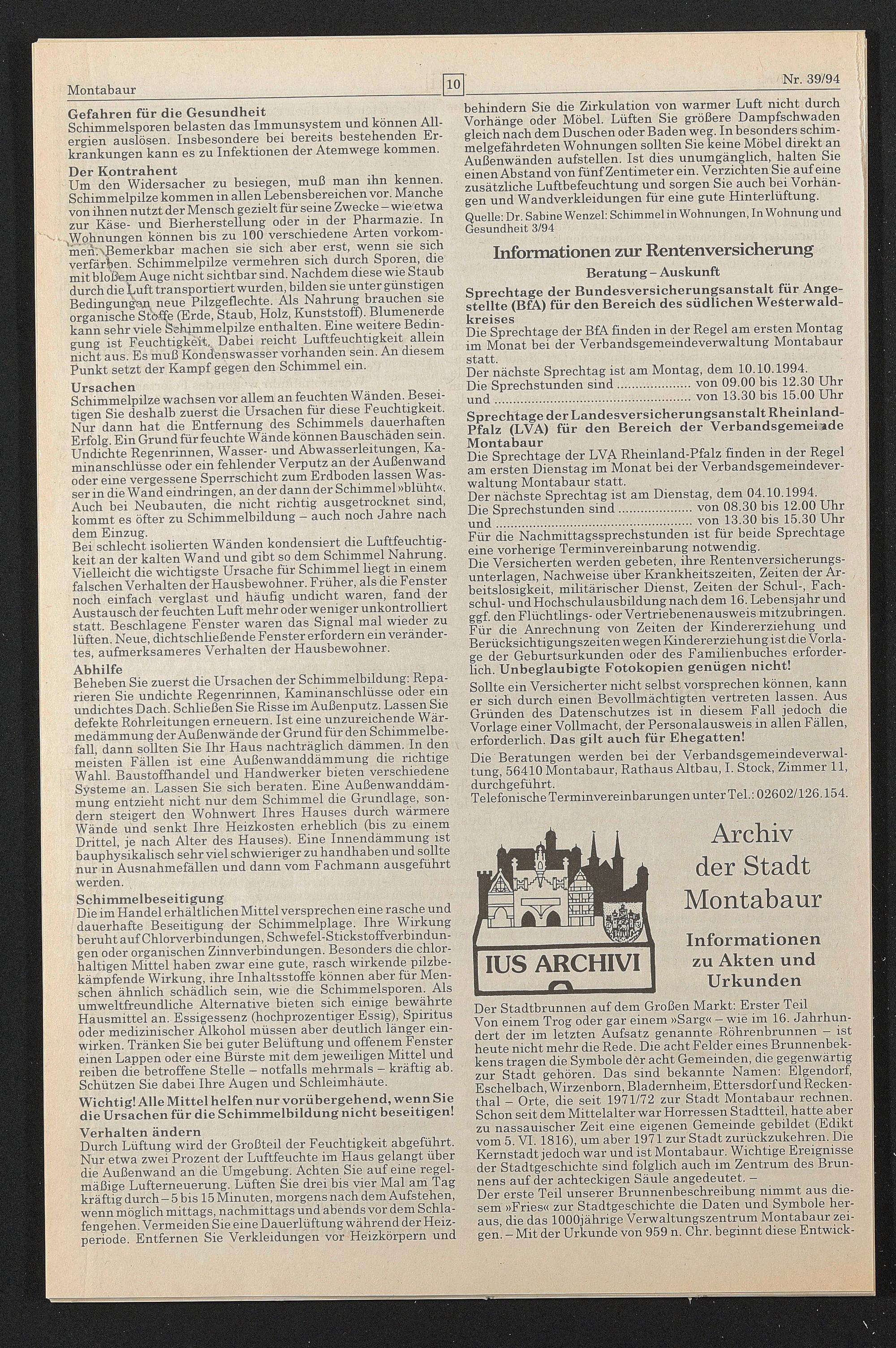Die Beratungen werden bei der Verbandsgemeindeverwaltung, 56410 Montabaur, Rathaus Altbau, I. Stock, Zimmer 11, durchgeführt.