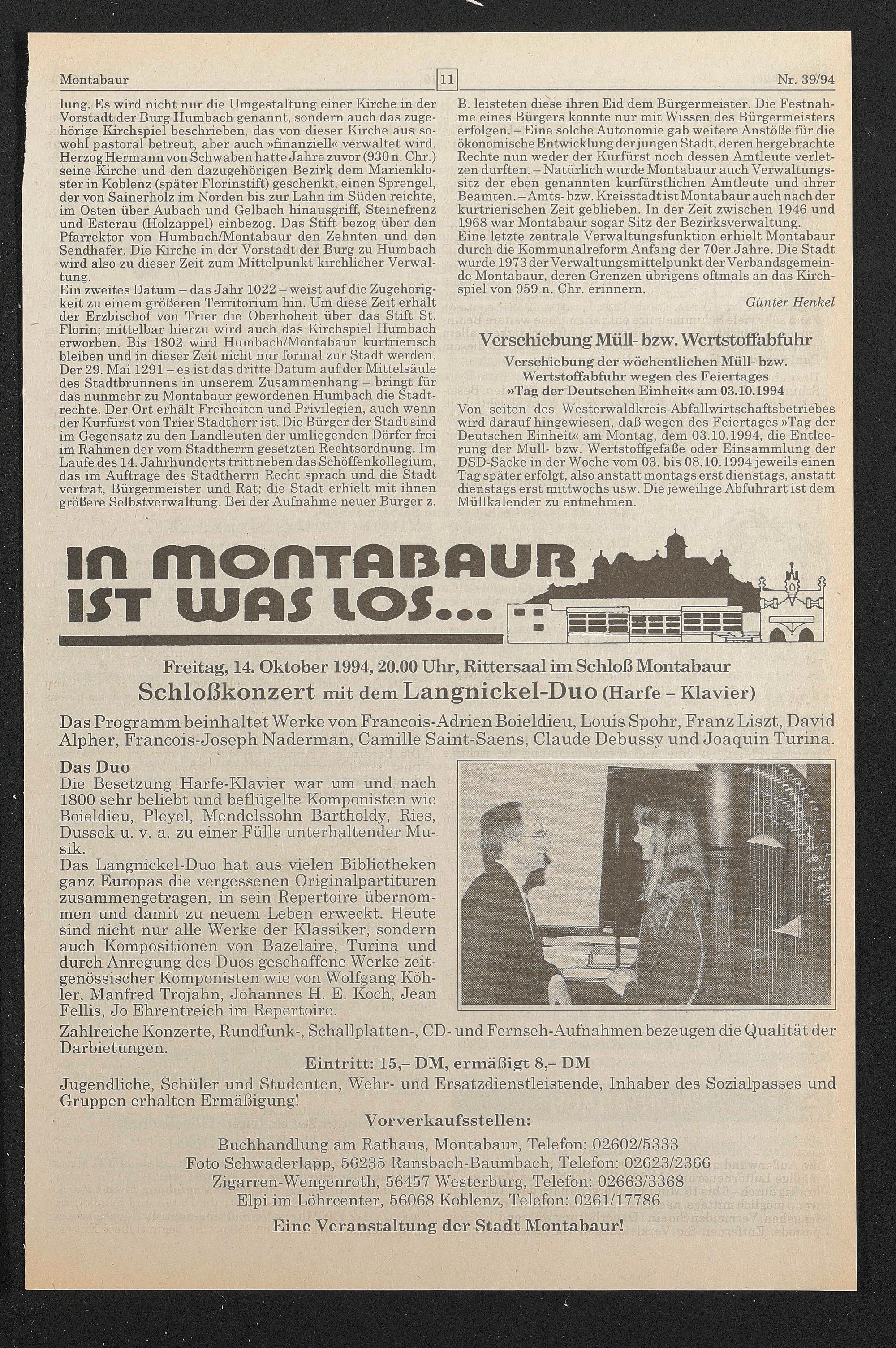Von seiten des Westerwaldkreis-Abfallwirtschaftsbetriebes wird daraufhingewiesen, daß wegen des Feiertages »Tag der Deutschen Einheit« am Montag, dem 03.10.1994, die Entleerung der Müll- bzw. Wertstoffgefäße oder Einsammlung der DSD-Säcke in der Woche vom 03. bis 08.10.1994 jeweils einen Tag später erfolgt, also anstatt montags erst dienstags, anstatt dienstags erst mittwochs usw. Die jeweilige Abfuhrart ist dem Müllkalender zu entnehmen.