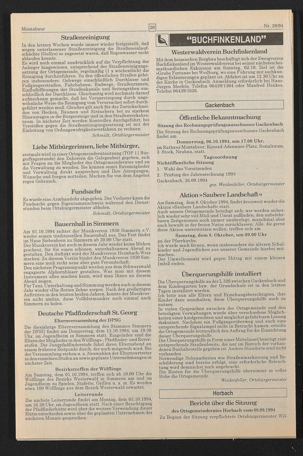 Donnerstag, 06.10.1994, um 17.00 Uhr, im Rathaus Montabaur, Konrad-Adenauer-Platz, Sozialraum, 3. Stock, Neubau, statt.