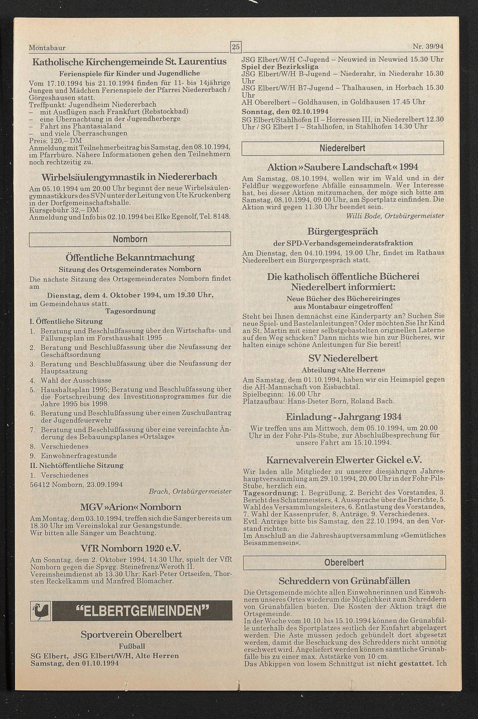 Am Sonntag, dem 2. Oktober 1994, 14.30 Uhr, spielt der VfR Nomborn gegen die Spvgg. Steinefrenz/Weroth II. Vereinsheimdienst ab 13.30 Uhr: Karl-Peter Ortseifen, Thorsten Reckeikamm und Manfred Blömacher.