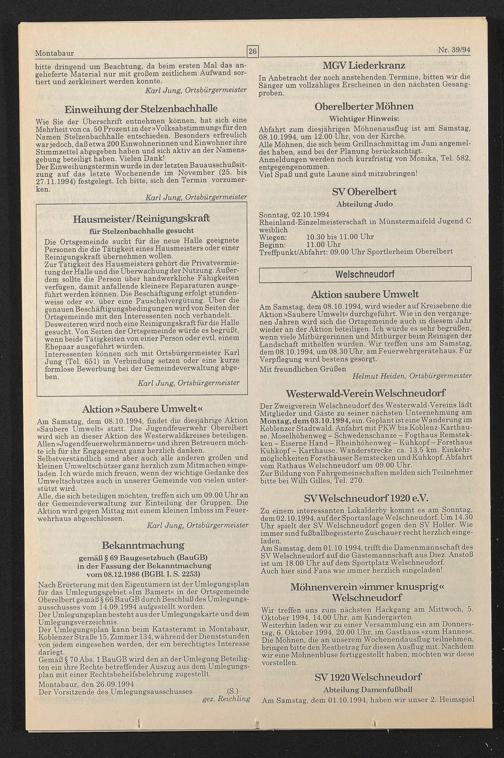 Am Samstag, dem 08.10.1994, wird wieder auf Kreisebene die Aktion »Saubere Umwelt« durchgeführt. Wie in den vergangenen Jahren wird sich die Ortsgemeinde auch in diesem Jahr wieder an der Aktion beteiligen. Ich würde es sehr begrüßen, wenn viele Mitbürgerinnen und Mitbürger beim Reinigen der Landschaft mithelfen würden. Wir treffen uns am Samstag, dem 08.10.1994, um 08.30 Uhr, am Feuerwehrgerätehaus. Für Verpflegung wird bestens gesorgt.