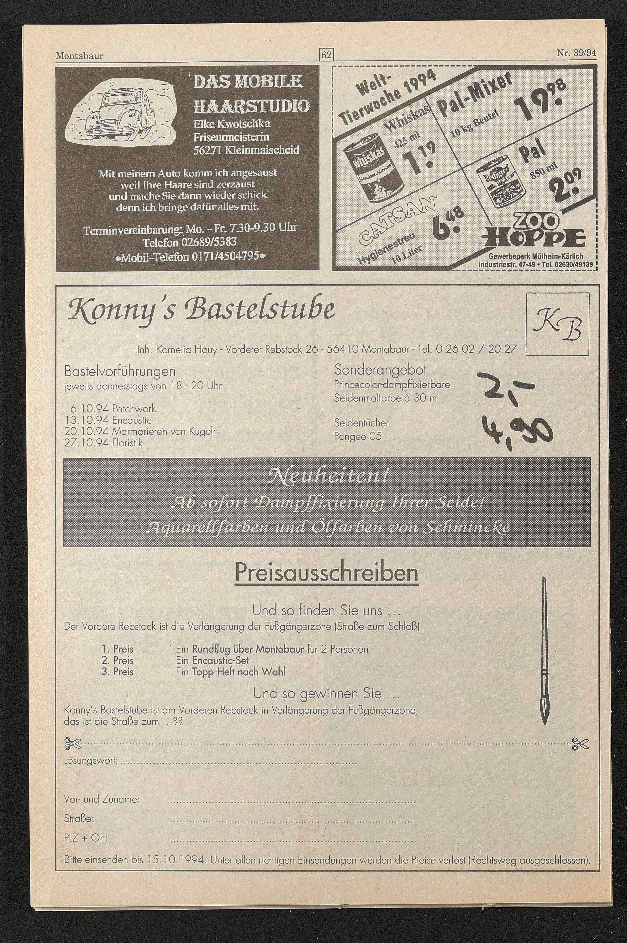 Bitte einsenden bis 15.10.1994. Unter allen richtigen Einsendungen werden die Preise verlost (Rechtsweg ausgeschlossen).