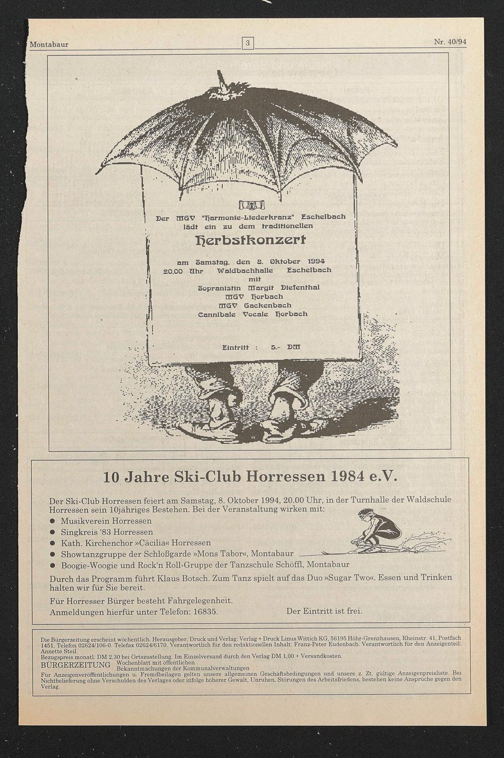 Die Bürgerzeitung erscheint wöchentlich. Herausgeber, Druck und Verlag: Verlag + Druck Linus Wittich KG, 56195 Höhr-Grenzhausen, Kheinstr. 41, Postfach 1451, Telefon 02624/106-0. Telefax 02624/6170. Verantwortlich für den redaktionellen Inhalt: Franz-Peter Eudenbach. Verantwortlich für den Anzeigenteil: Annette Steil. '