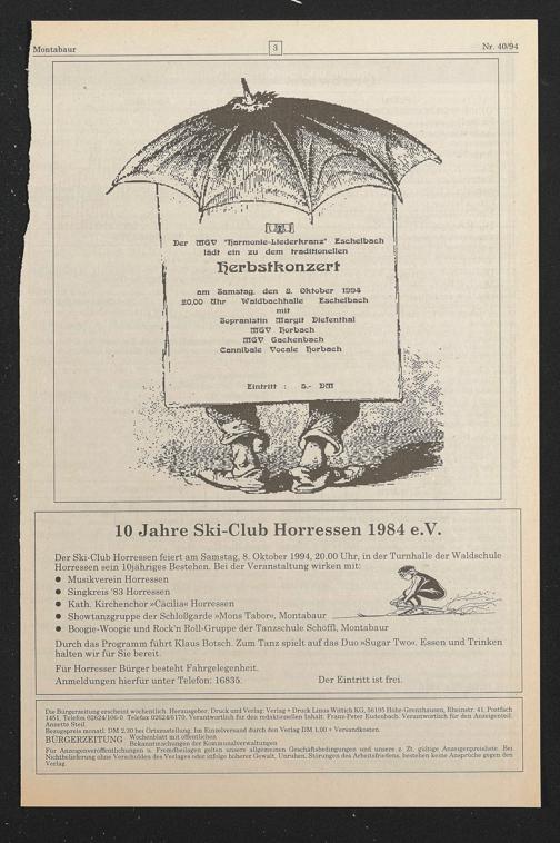 Der Ski-Club Horressen feiert am Samstag, 8. Oktober 1994, 20.00 Uhr, in der Turnhalle der Waldschule Horressen sein lOjähriges Bestehen. Bei der Veranstaltung wirken mit: