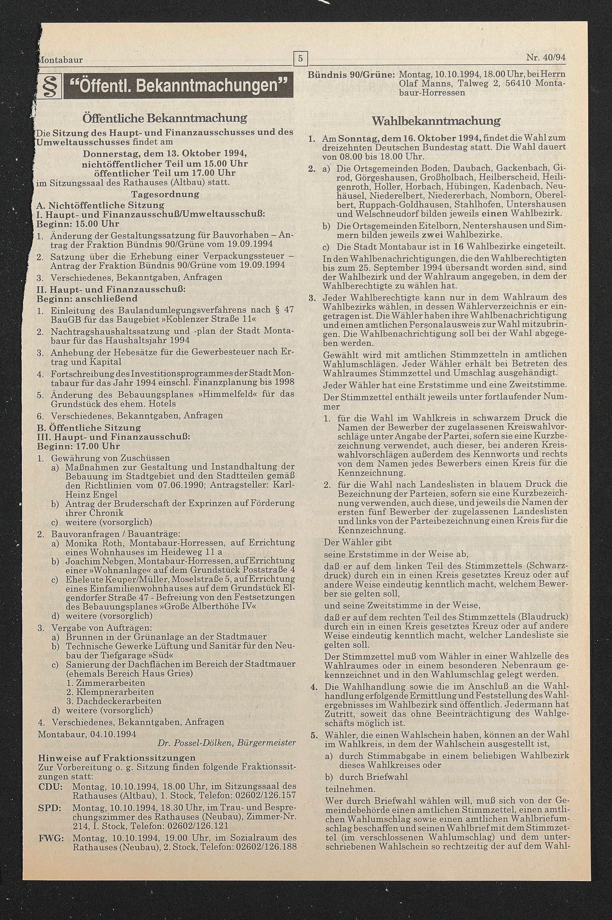 4. Verschiedenes, Bekanntgaben, Anfragen Montabaur, 04.10.1994