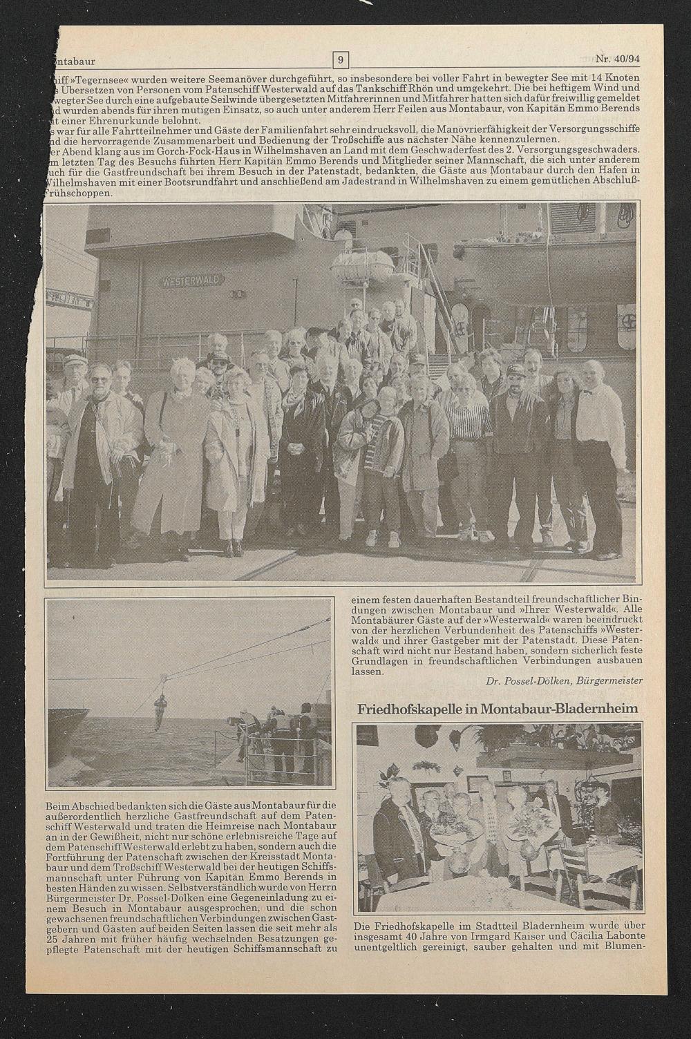 einem festen dauerhaften Bestandteil freundschaftlicher Bindungen zwischen Montabaur und »Ihrer Westerwald«. Alle Montahäurer Gäste auf der »Westerwald« waren beeindruckt von der herzlichen Verbundenheit des Patenschiffs »Westerwald« und ihrer Gastgeber mit der Patenstadt. Diese Patenschaft wird nicht nur Bestand haben, sondern sicherlich feste Grundlagen in freundschaftlichen Verbindungen ausbauen lassen.