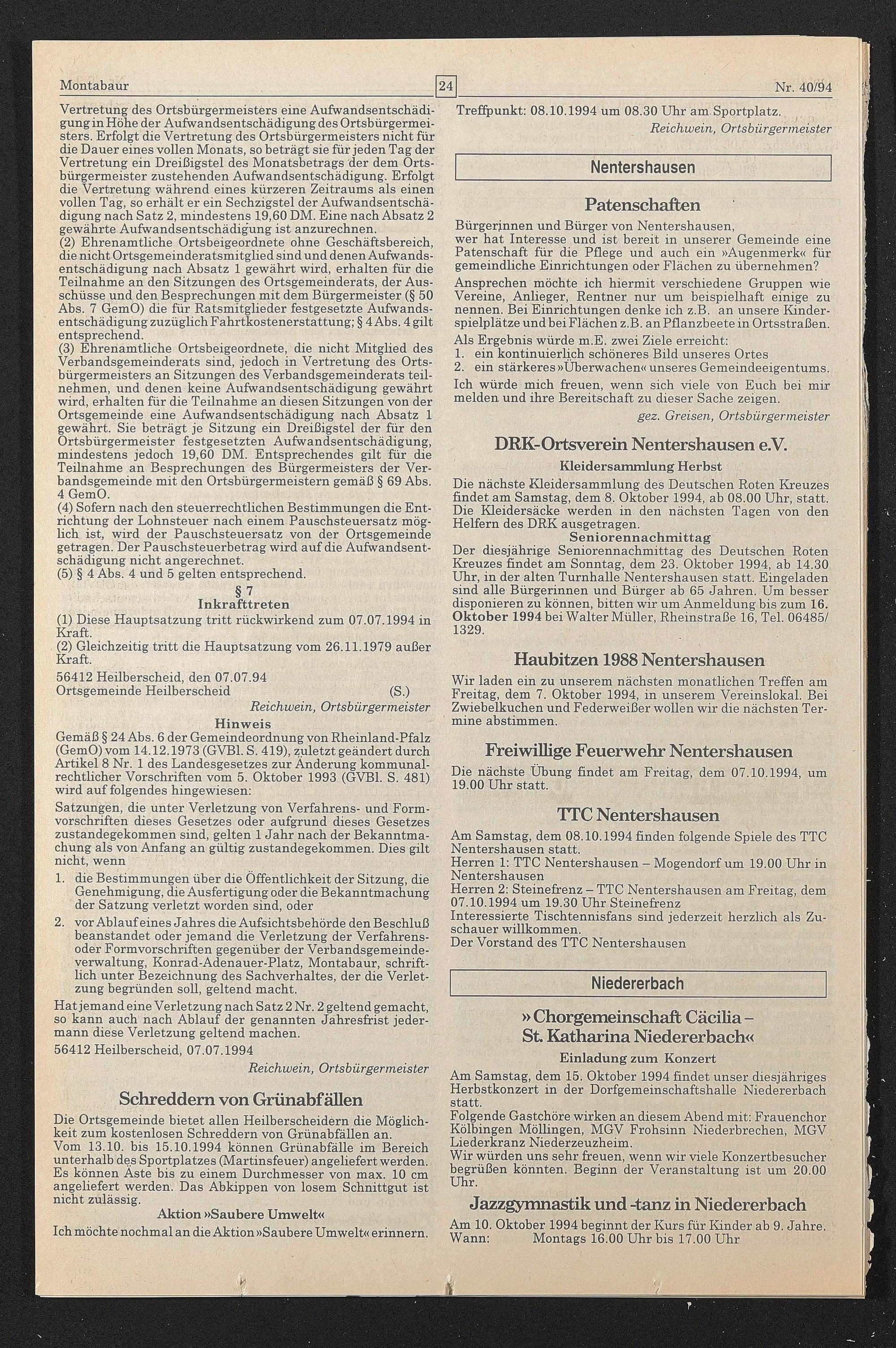 Der diesjährige Seniorennachmittag des Deutschen Roten Kreuzes findet am Sonntag, dem 23. Oktober 1994, ab 14.30 Uhr, in der alten Turnhalle Nentershausen statt. Eingeladen sind alle Bürgerinnen und Bürger ab 65 Jahren. Um besser disponieren zu können, bitten wir um Anmeldung bis zum 16. Oktober 1994 bei Walter Müller, Rheinstraße 16, Tel. 06485/ 1329.