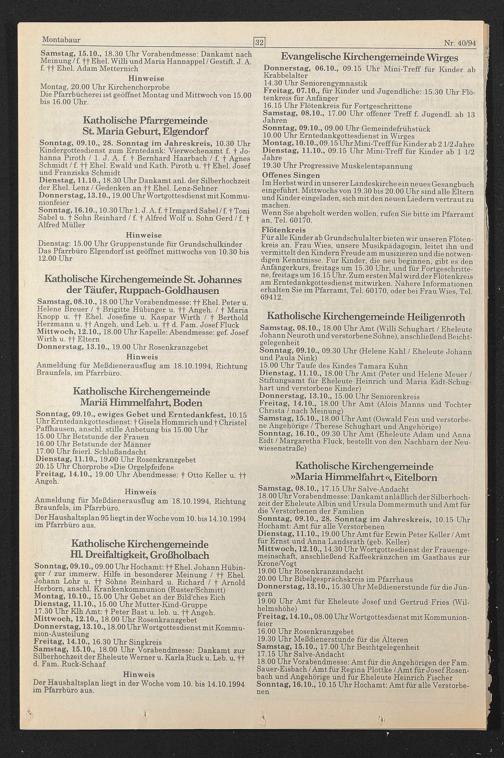 Samstag, 15.10., 18.00 Uhr Amt (Oswald Fein und verstorbene Angehörige / Therese Schughart und Angehörige) Sonntag, 16.10., 09.30 Uhr Amt (Eheleute Adam und Anna Eidt / Margaretha Fluck, bestellt von den Nachbarn der Neuwiesenstraße)