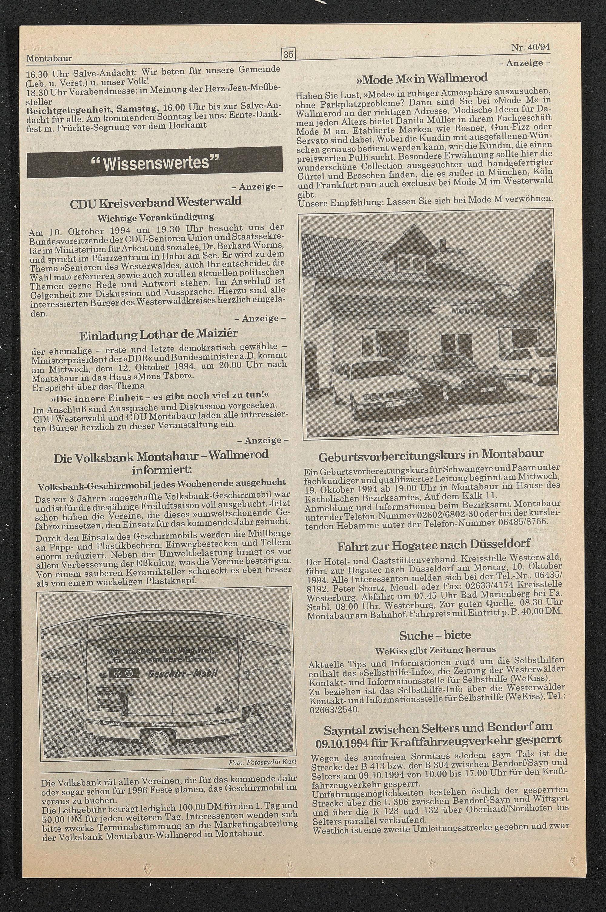 Wegen des autofreien Sonntags »Jedem sayn Tal« ist die Strecke der B 413 bzw. der B 304 zwischen Bendorf/Sayn und Selters am 09.10.1994 von 10.00 bis 17.00 Uhr für den Kraftfahrzeugverkehr gesperrt.