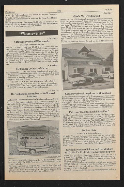 Am 10. Oktober 1994 um 19.30 Uhr besucht uns der Bundesvorsitzende der CDU-Senioren Union und Staatssekretär im Ministerium für Arbeit und soziales, Dr. Berhard W orms, und spricht im Pfarrzentrum in Hahn am See. Er wird zu dem Thema »Senioren des Westerwaldes, auch Ihr entscheidet die Wahl mit« referieren sowie auch zu allen aktuellen politischen Themen gerne Rede und Antwort stehen. Im Anschluß ist Gelgenheit zur Diskussion und Aussprache. Hierzu sind alle interessierten Bürger des Westerwaldkreises herzlich eingeladen.